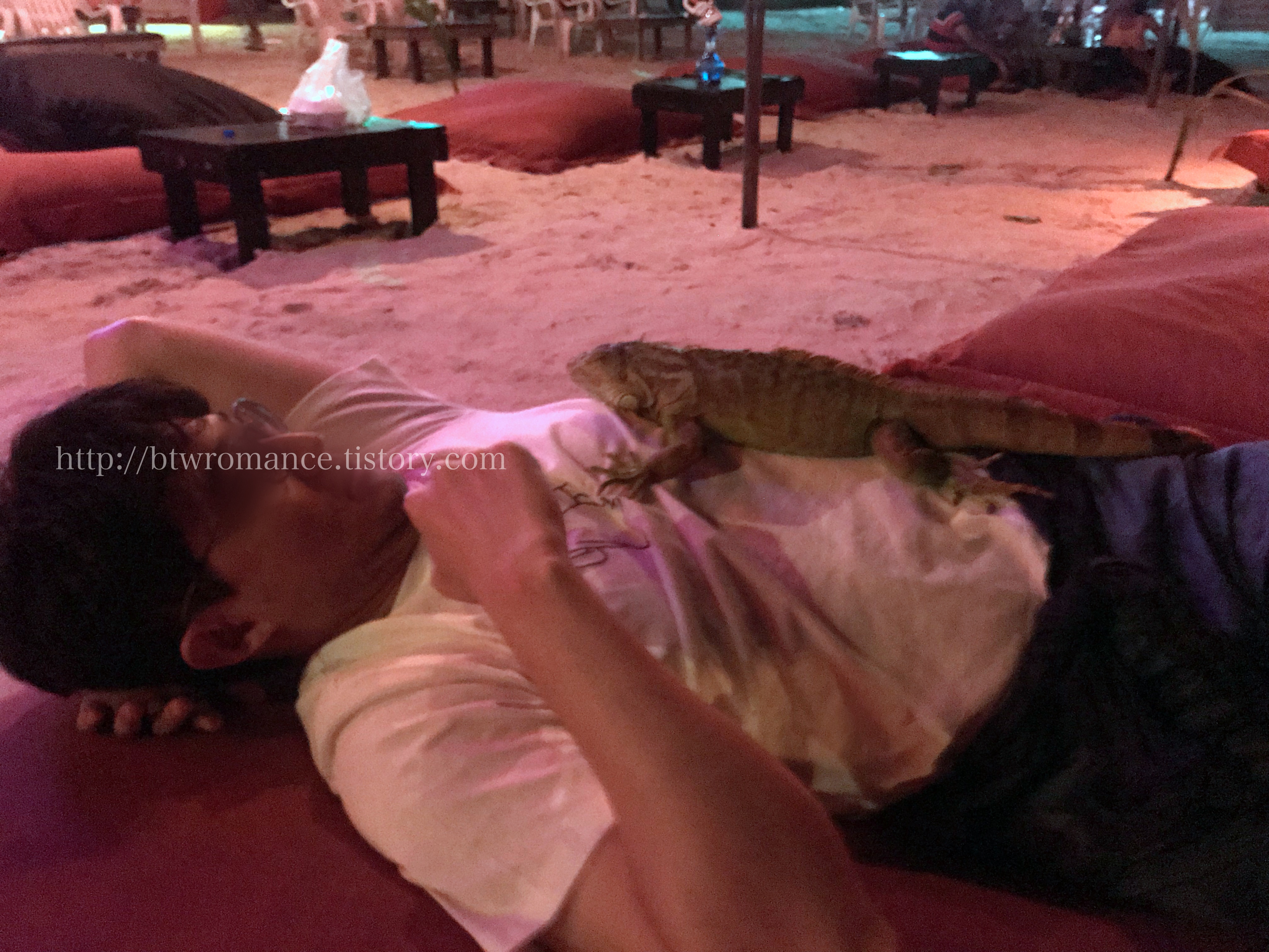 어떤 분이 꽤 큰 도마뱀?? 류를 들고 오더니 자연스럽게 남펴니의 배 위에 올려놓았다..! 그러더니 "포토~ 포토~ (사진 찍으라는 듯)"라는 게 아닌가