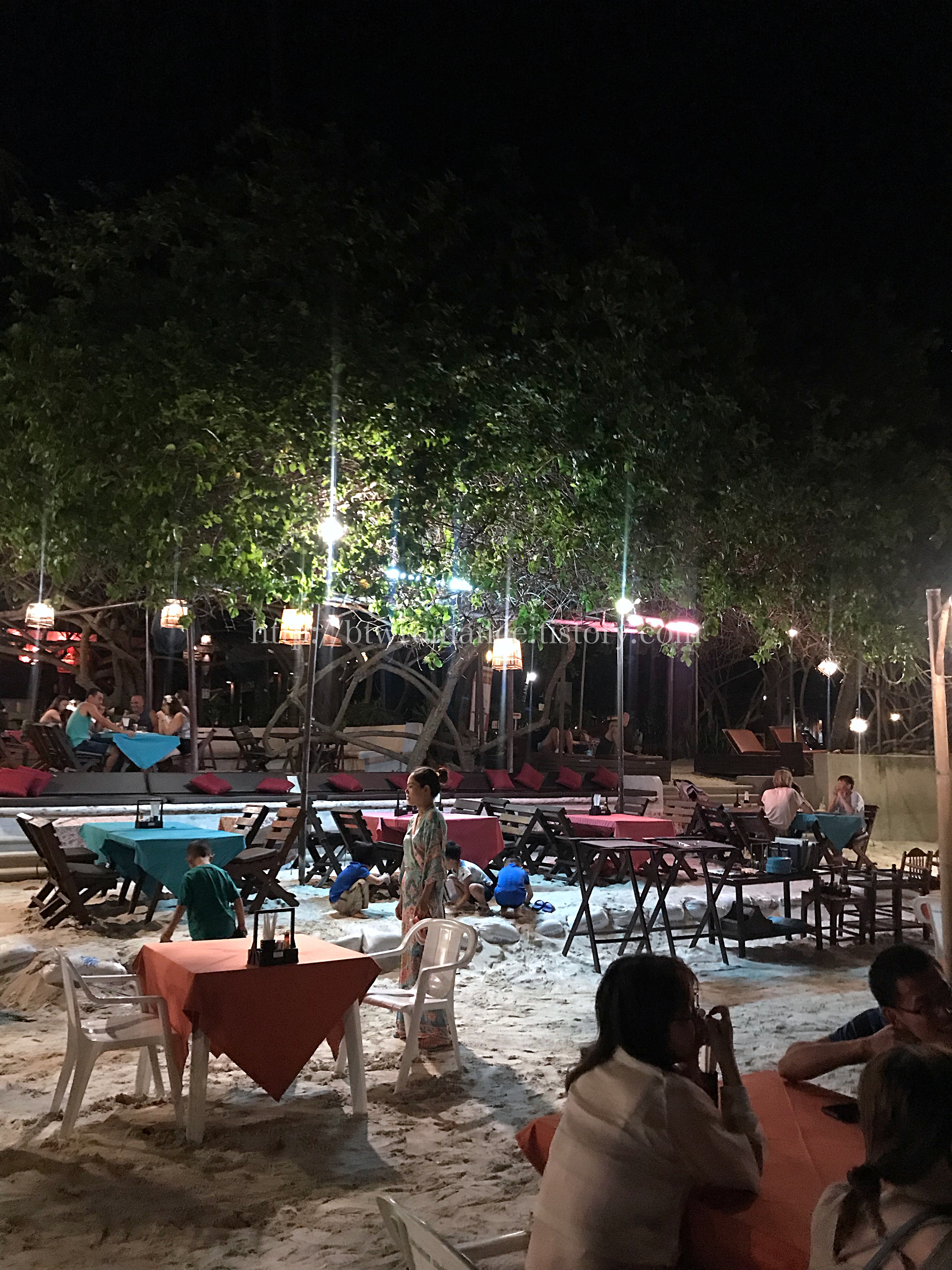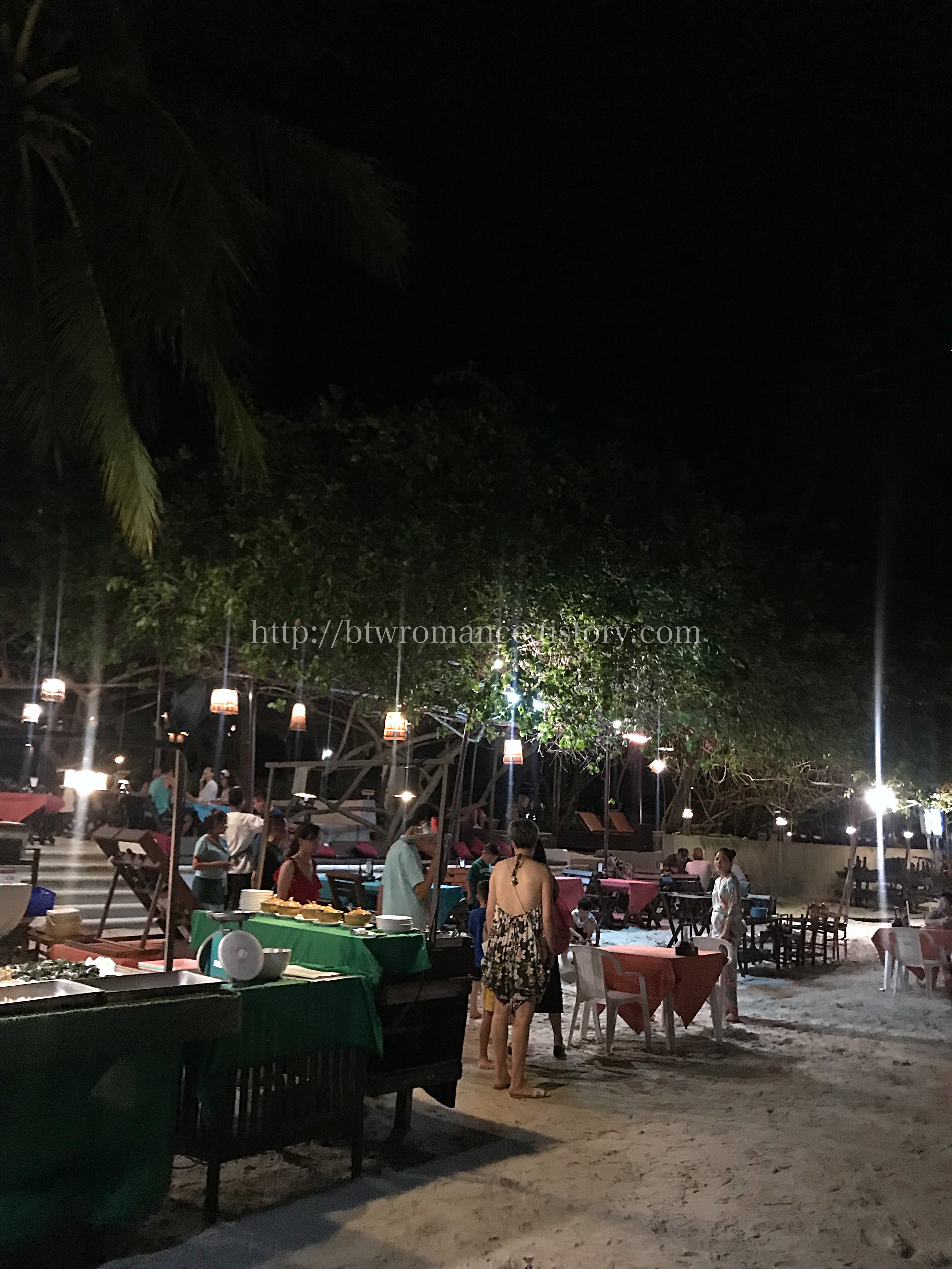 리조트를 가로질러 해변가로 걸어 나가보니, 모래사장에 야외 테이블이 펼쳐져있었다.