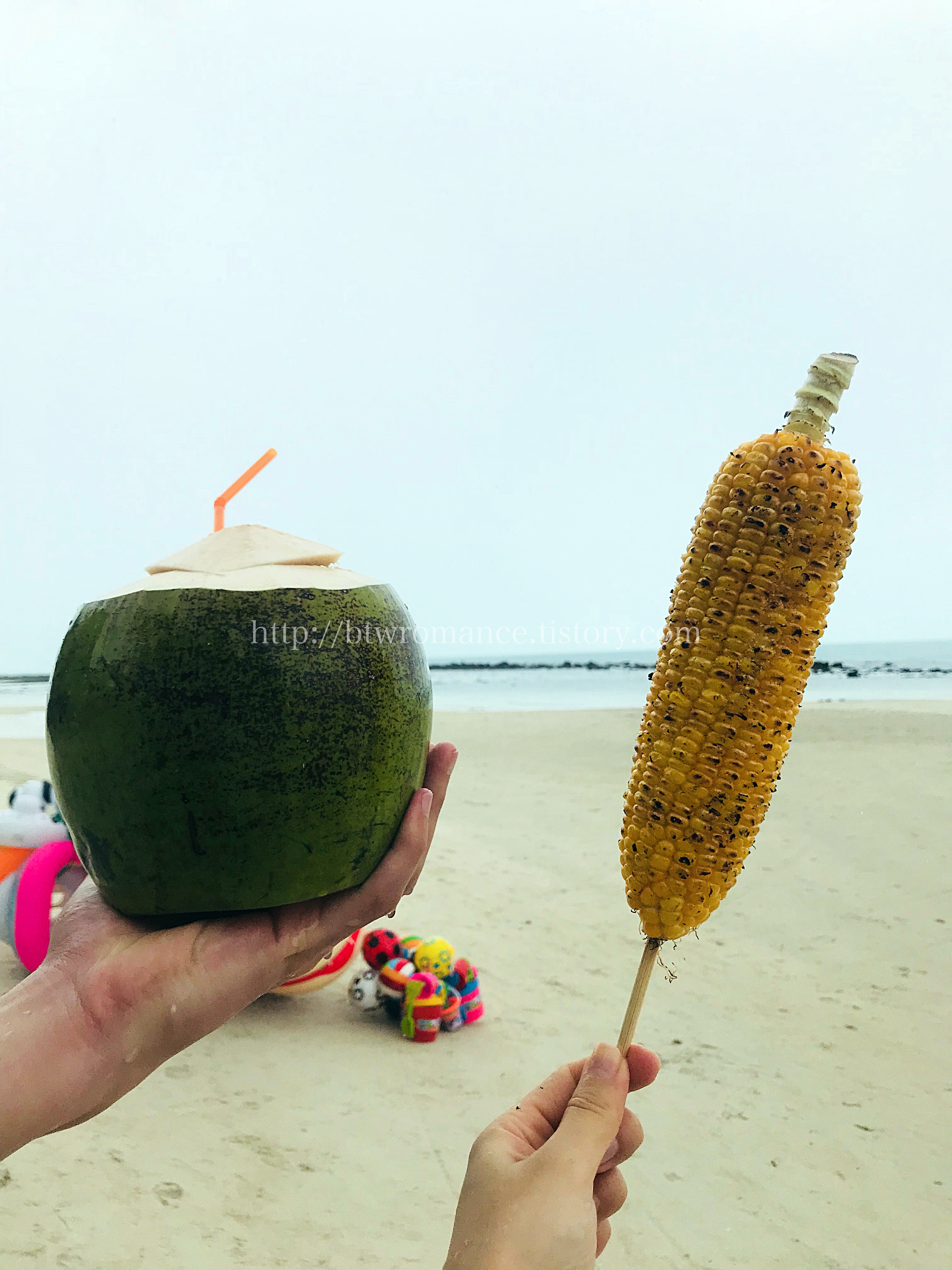 모래사장에서 파는 코코넛이랑 구운 옥수수를 사서 다시 리조트로 돌아가는 길에,