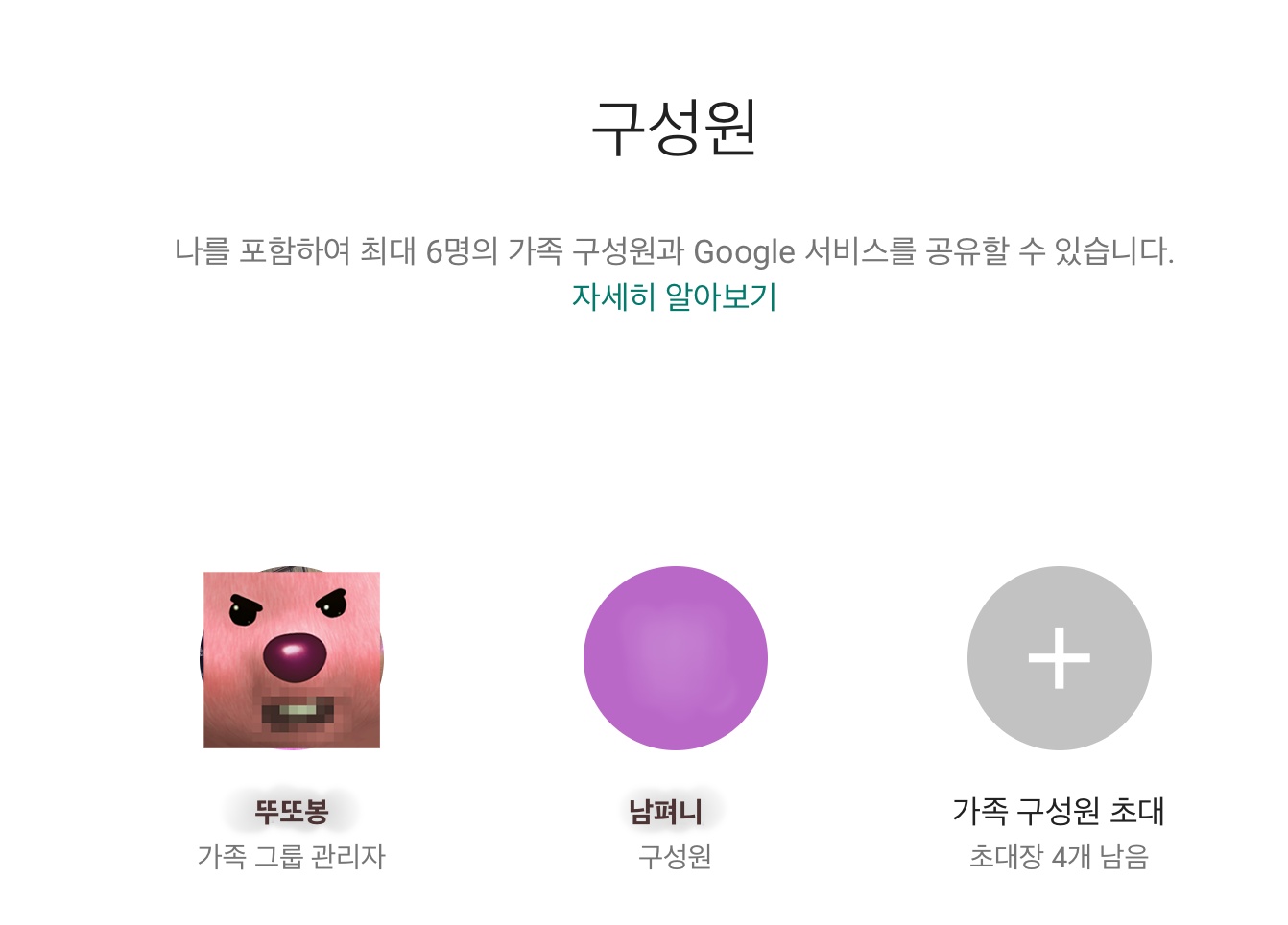 3. 구성원을 최대 6명까지 설정이 가능하다. 제일오른쪽 + 버튼을 눌러서 가족의 구글 메일주소로 초대장을 보낸다. 초대장을 받은 가족이 메일에 확인버튼을 누르면 가족 구성원으로 추가가 된다.