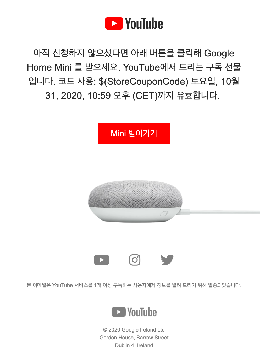 유튜브 프리미엄에서 심지어 구글홈미니(Google Home MIni) 도 선물이라고 보내줬다.