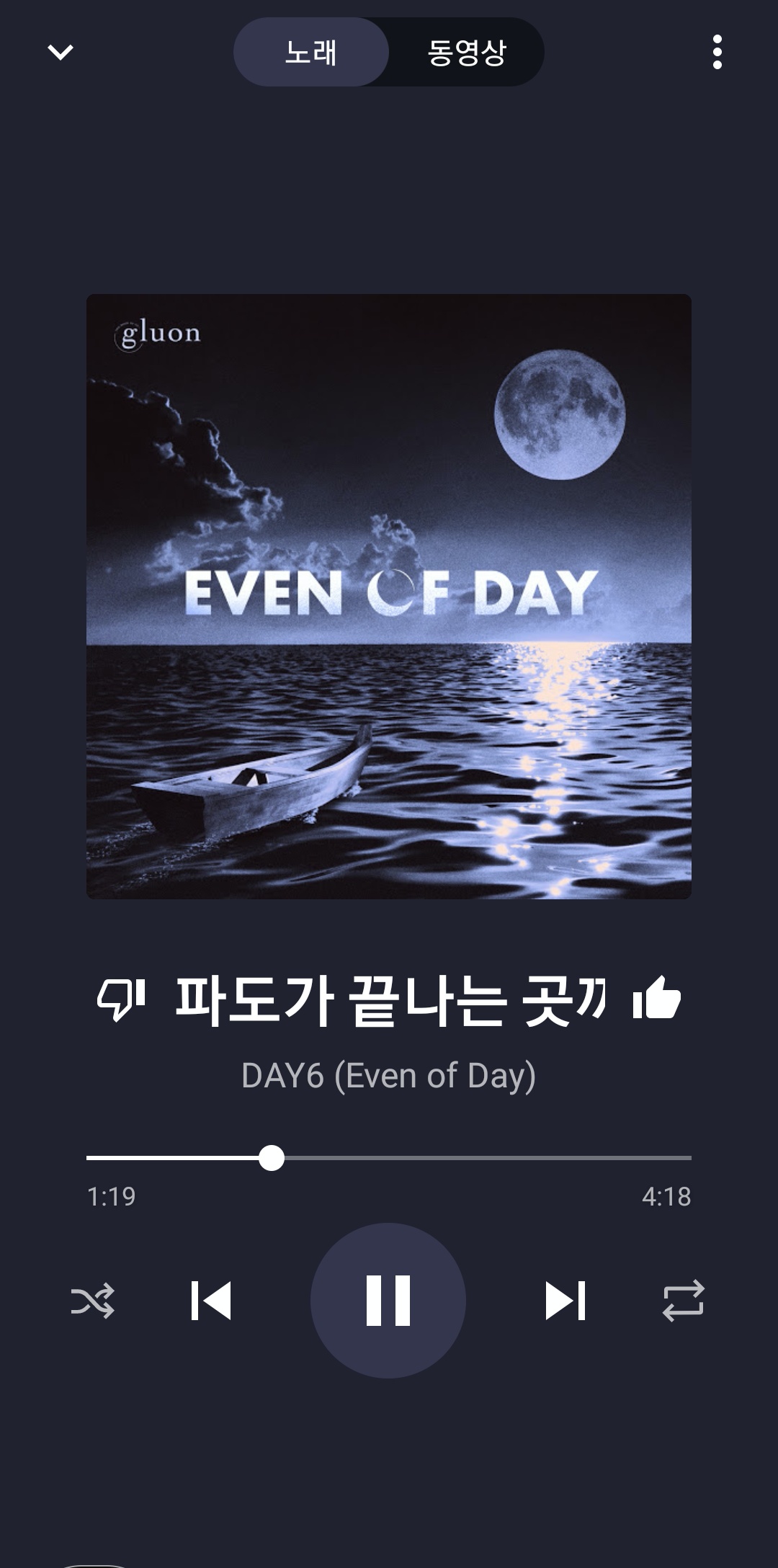 음악을 드다가 위에 노래/동영상 버튼을 동영상으로 밀면 듣던 음악이 그대로 영상으로 이어져 뮤직비디오를 감상 할 수있다.