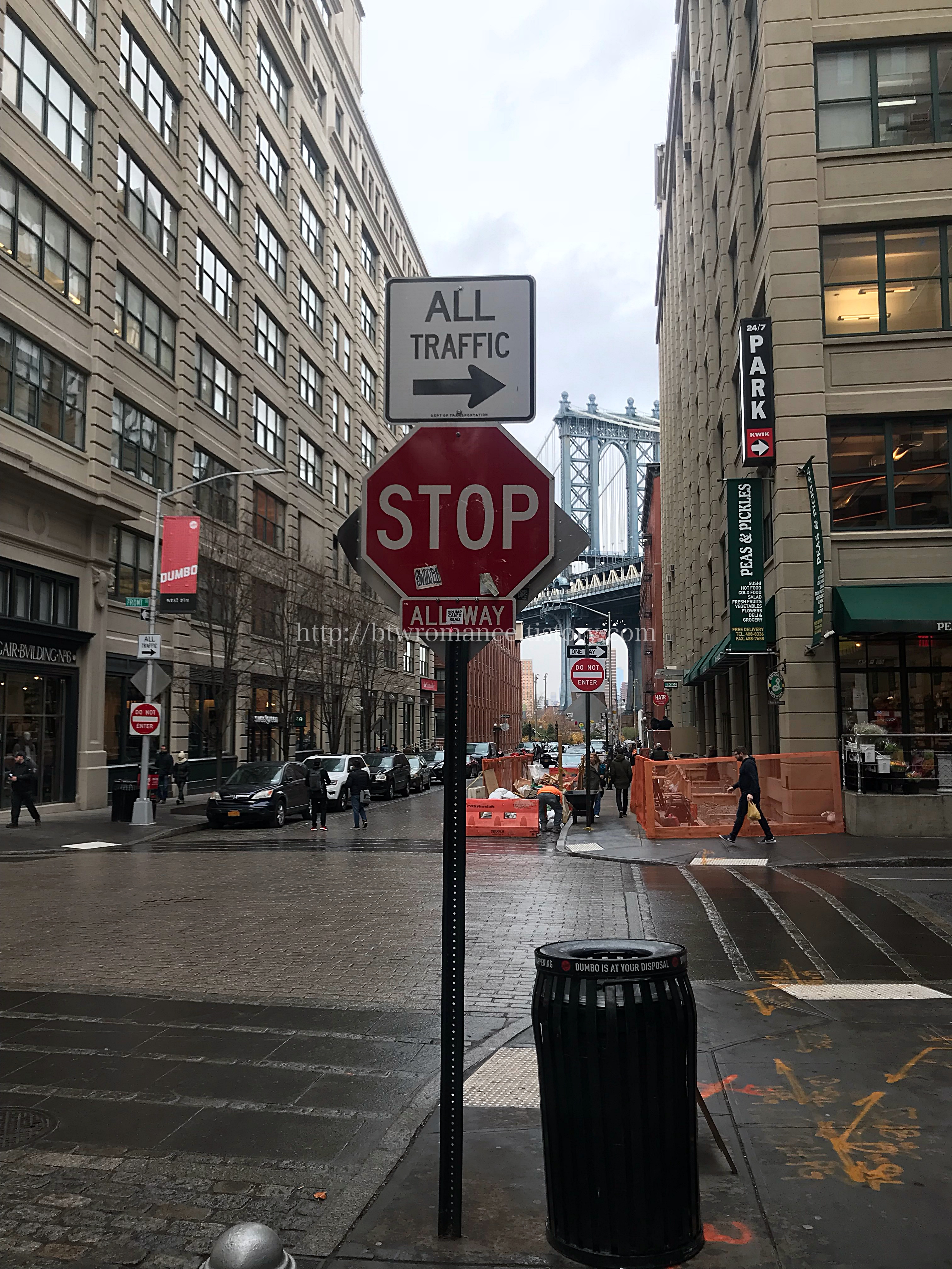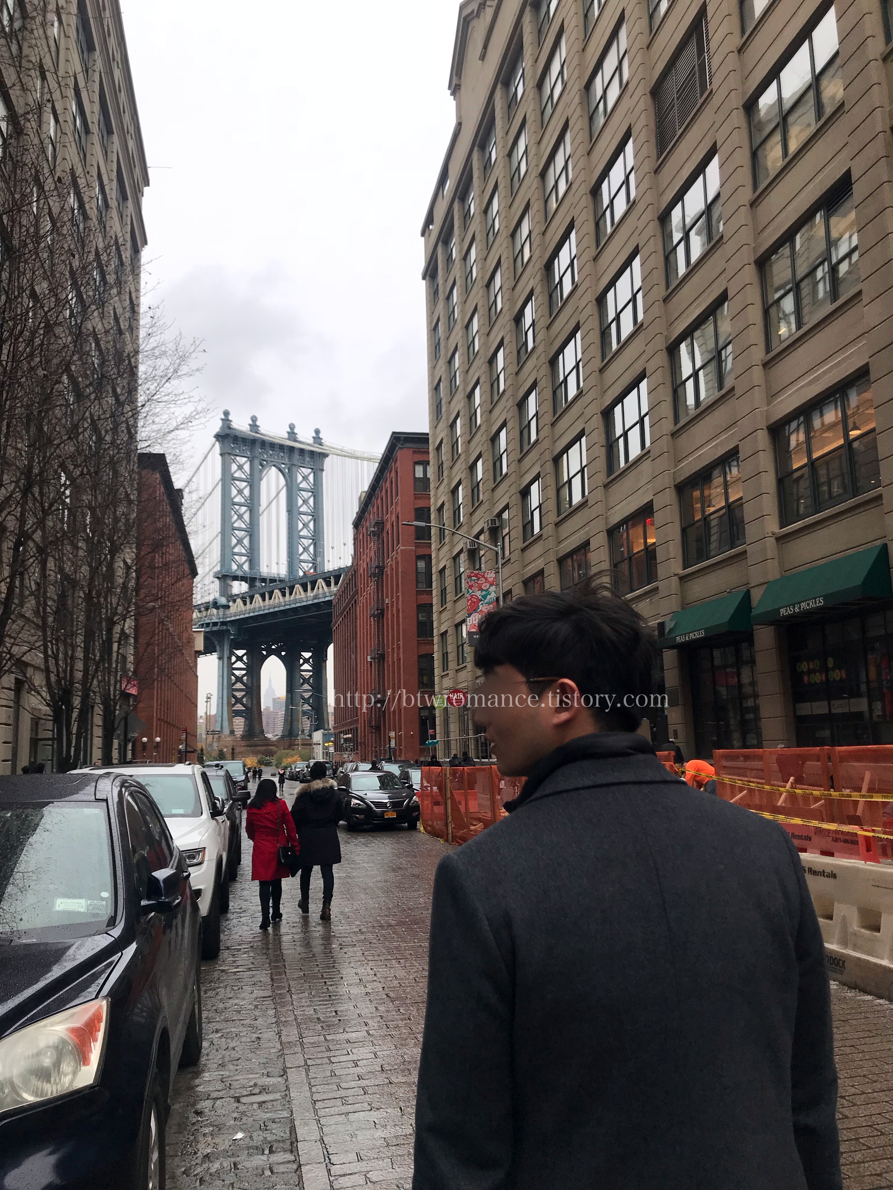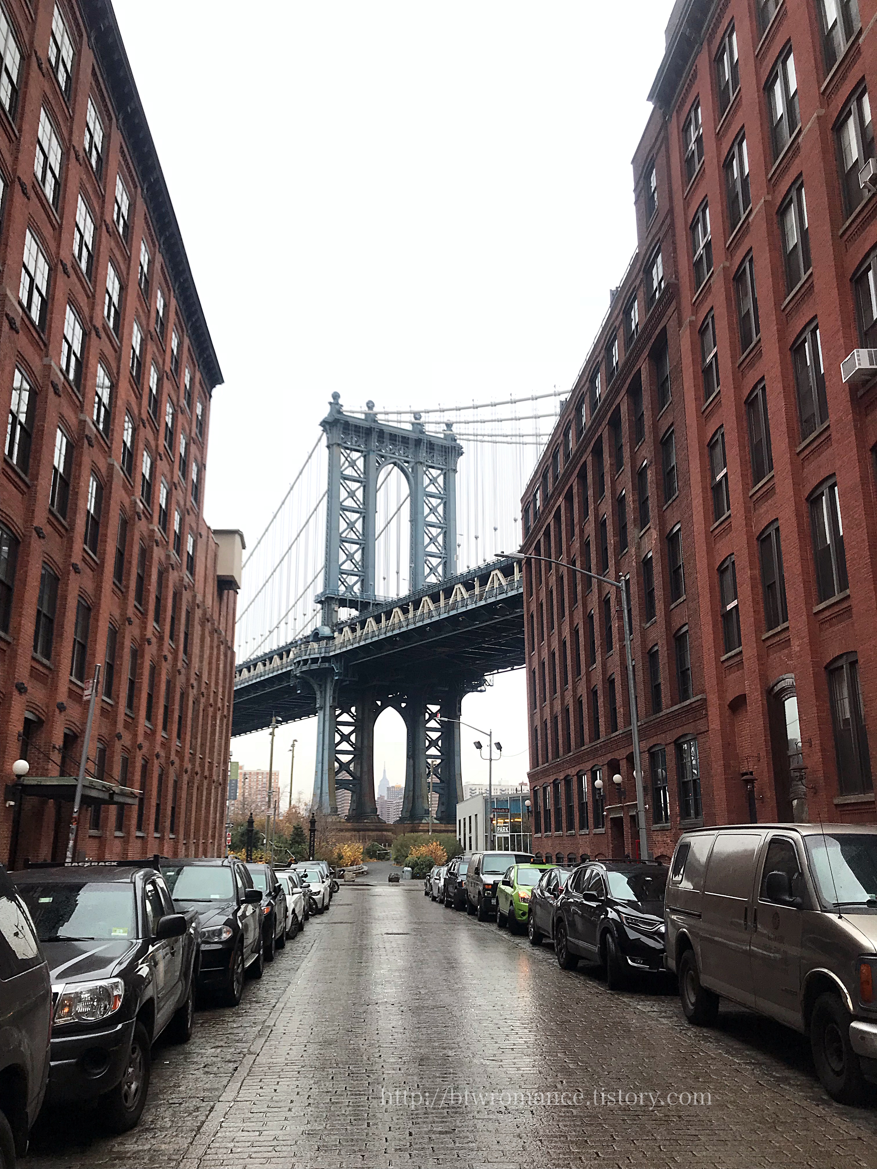 이곳은 무한도전이 뉴욕에 와서 사진 촬영을 해서 한국사람들에게 익숙하기도 하고, 전 세계 패션 잡지에서 화보를 찍기도 해서 워낙 익숙한 곳이다. 가까운 지하철 역에서 내려 아무것도 없을 것 같은 골목을 지나다 보면 어느새 브루클린 브릿지가 두 건물 사이에서 빼꼼 고개를 내민다. 이 날 날씨가 흐렸고 비도 왔다 멈췄다 해서 바닥은 촉촉한 그 느낌이 있었는데, 브루클린의 모습과 무척 잘 어울리기도 했다.
