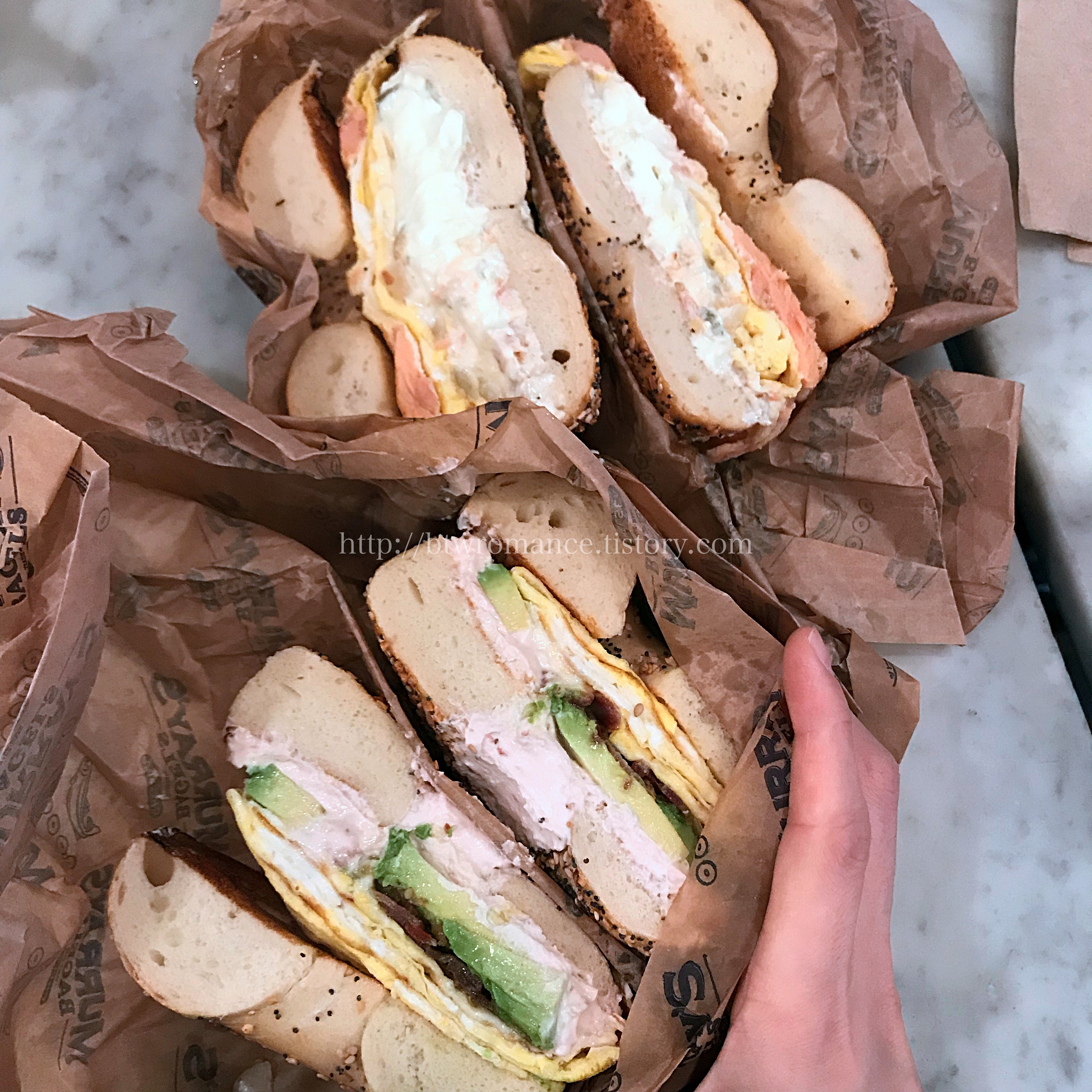 오늘 나는 에브리띵베이글에 계란 프라이, 아보카도, 살라미, 크림치즈를 골랐고 남펴니는 훈제연어에 도전했다.
