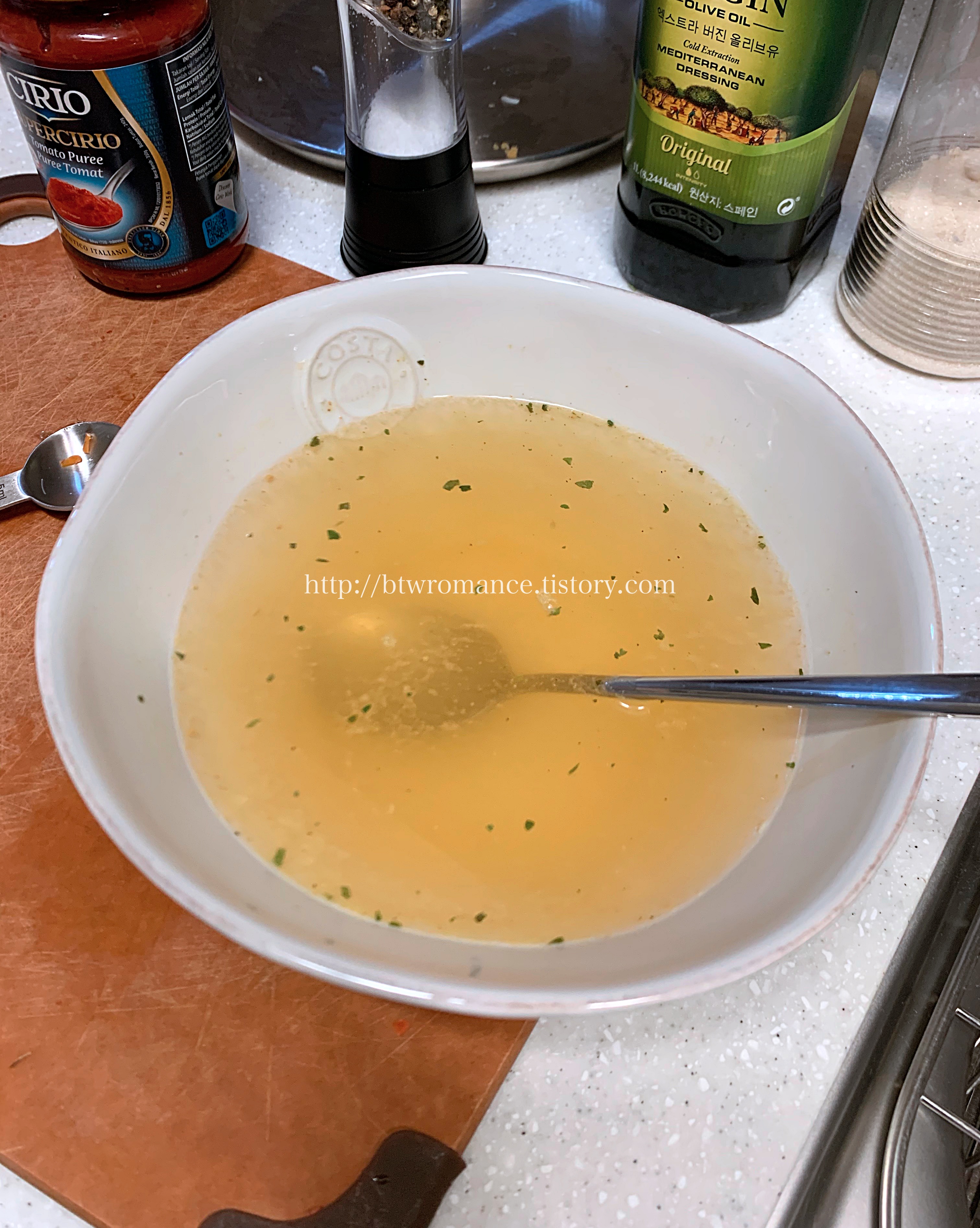물 200ml 정도에 치킨스톡을 적당히 맛이 날 정도로 풀어서 넣어주었다.
