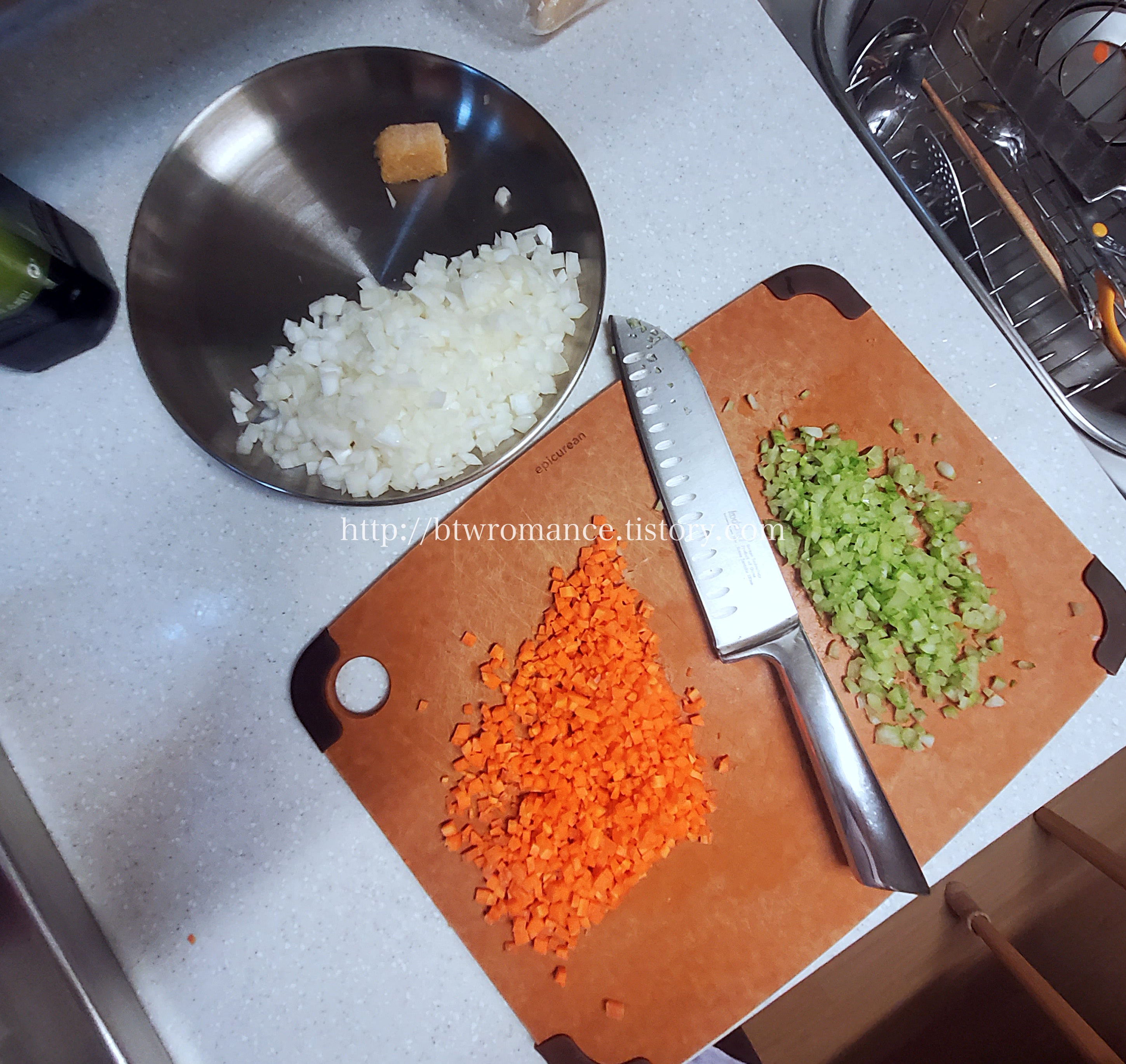 이 요리의 모든 준비는 이정도면 된다, 사실 야채다지기가 있으면 최상이지만 산다 산다해놓고 까먹어서 손으로 다졌음.