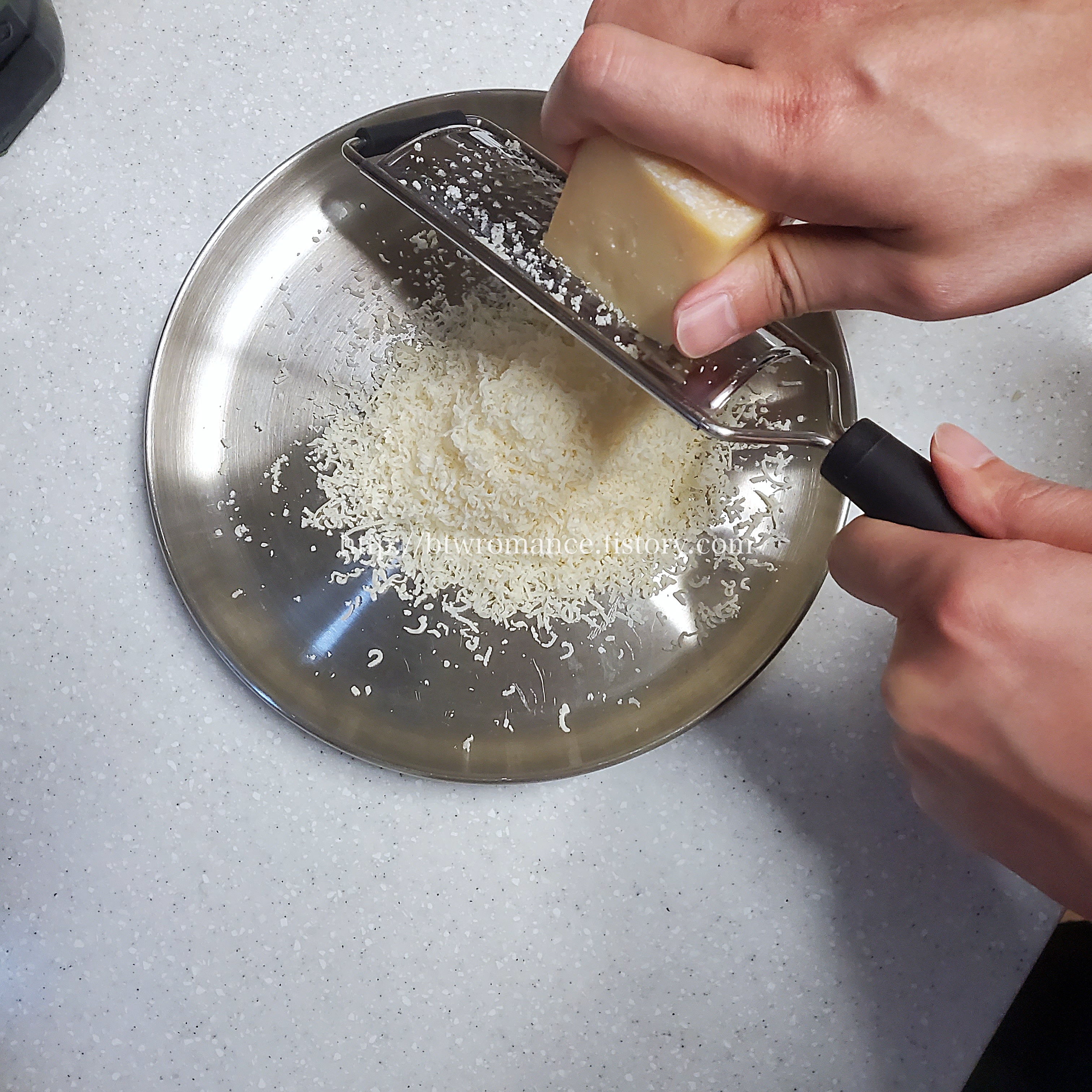 그리고 나서 이제 깊은 맛을 더해주기 위해 치즈를 넣어줘야하는데,파마산 치즈를 갈아서 넣어주었다. 파마산 치즈 혹은 레기아노 치즈는 고체 형태로 보관하다가 필요할 때 바로바로 갈아서 쓰는게 신선하고 향도 잘난다. 우리는 치즈향을 좋아하기 때문에 듬뿍 갈아 넣었다.