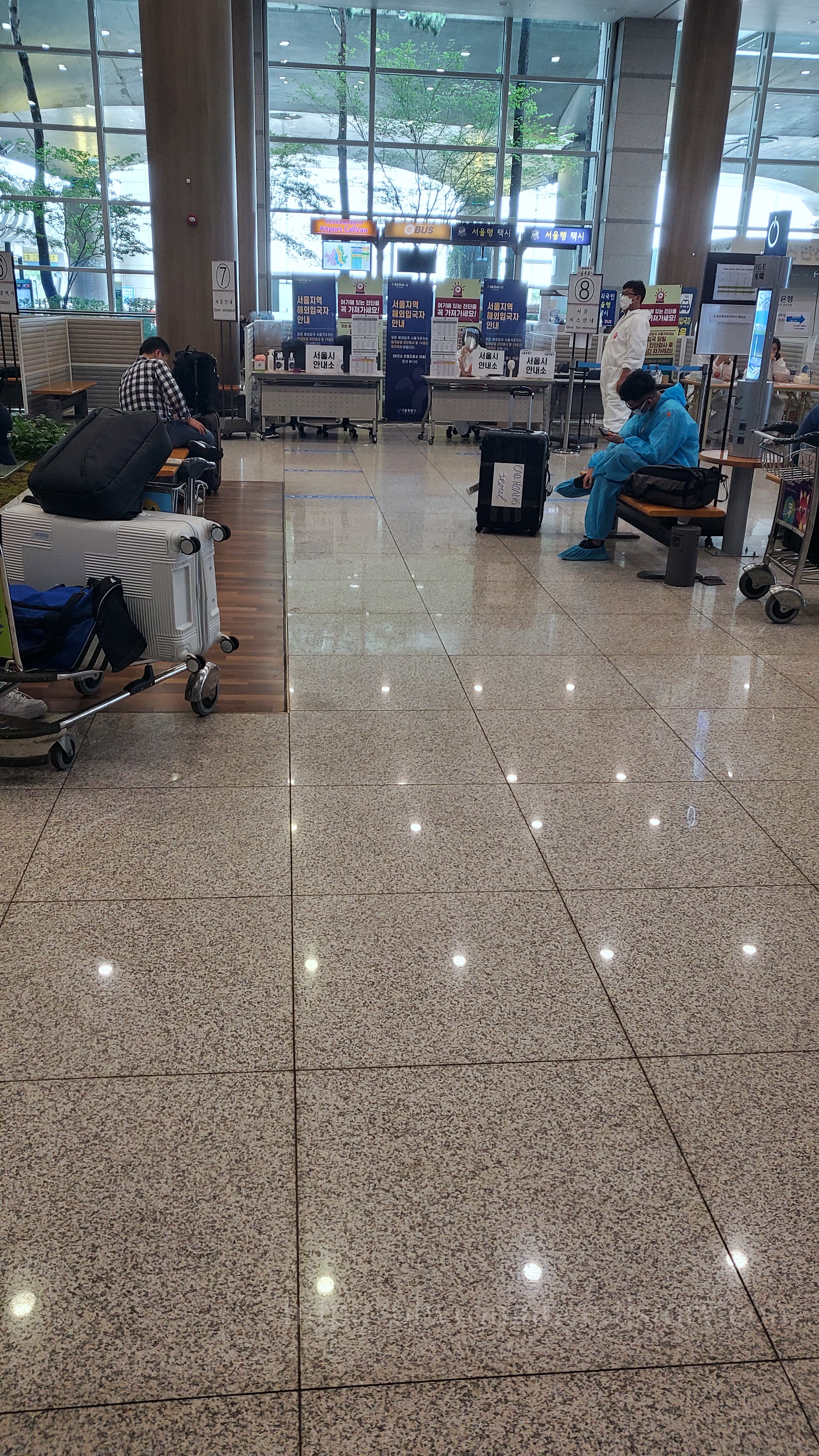 그곳에서는 자가격리 앱을 다운로드하여서 열어서 신상정보 (자가격리할 주소, 전화번호 등등)를 적고 확인 버튼을 누른 사람 먼저 통과가 가능하다. 아무리 먼저 뛰어가도, 어플을 다운받아 신상정보를 쓰다보면 이미 다운받아 놓은 재빠른 사람들에게 순서를 양보해야한다. 한국 입국 전부터 다운받아 놓고, 인천공항 도착즈음엔 어플을 열어 신상을 작성해 두는걸 추천한다. (비행기모드에서도 작동됨)