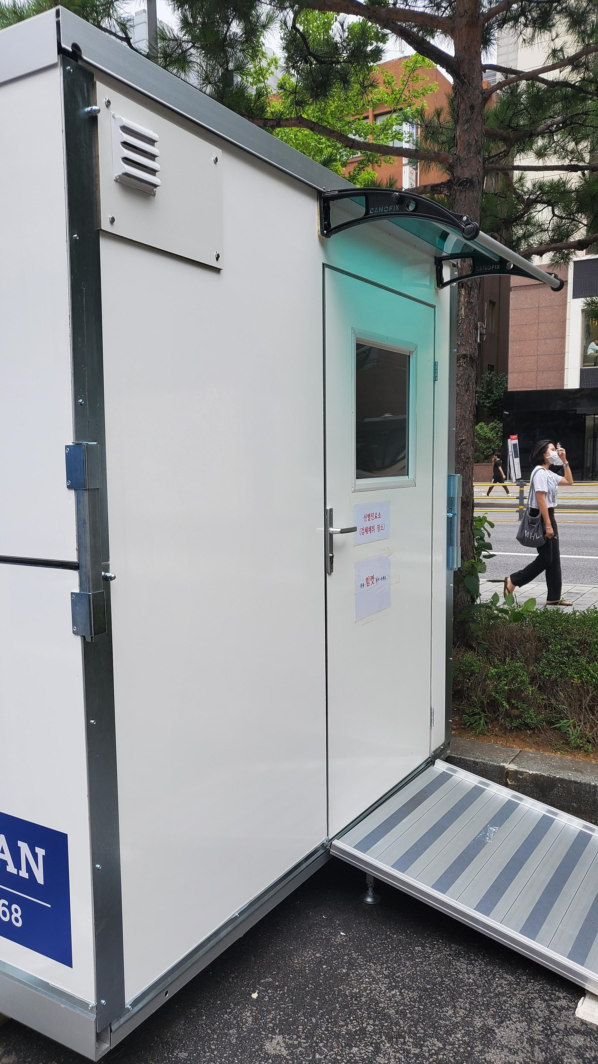 내 코와 입에 들어갈 면봉을 수령한 다음 사진 속 컨테이너 박스 같은 곳에 들어가서 검사를 받았다.