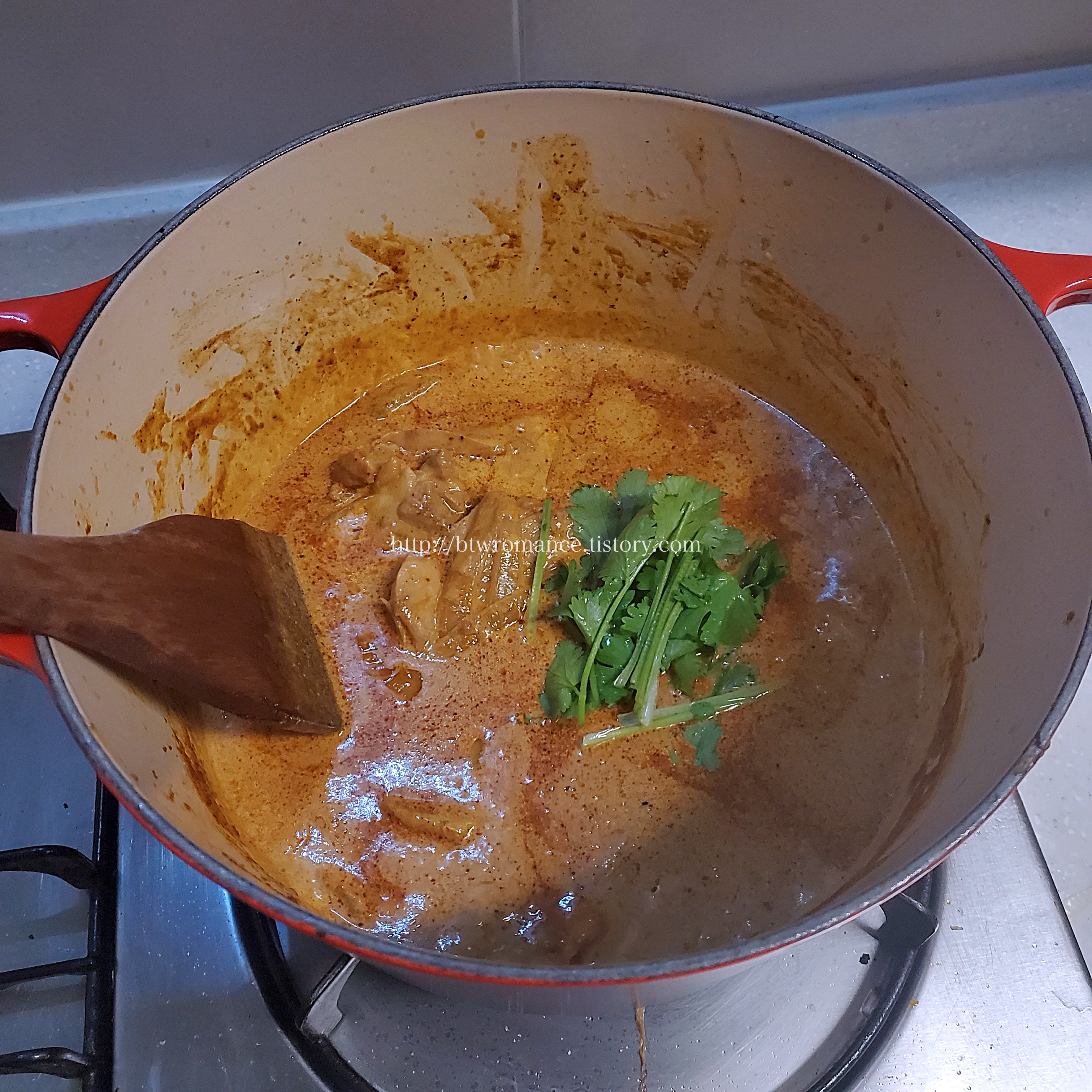 우유를 넣고 5에서10분 정도 끓이고, 취향에 따라 고수를 넣어주면 또 그렇게 맛있다.