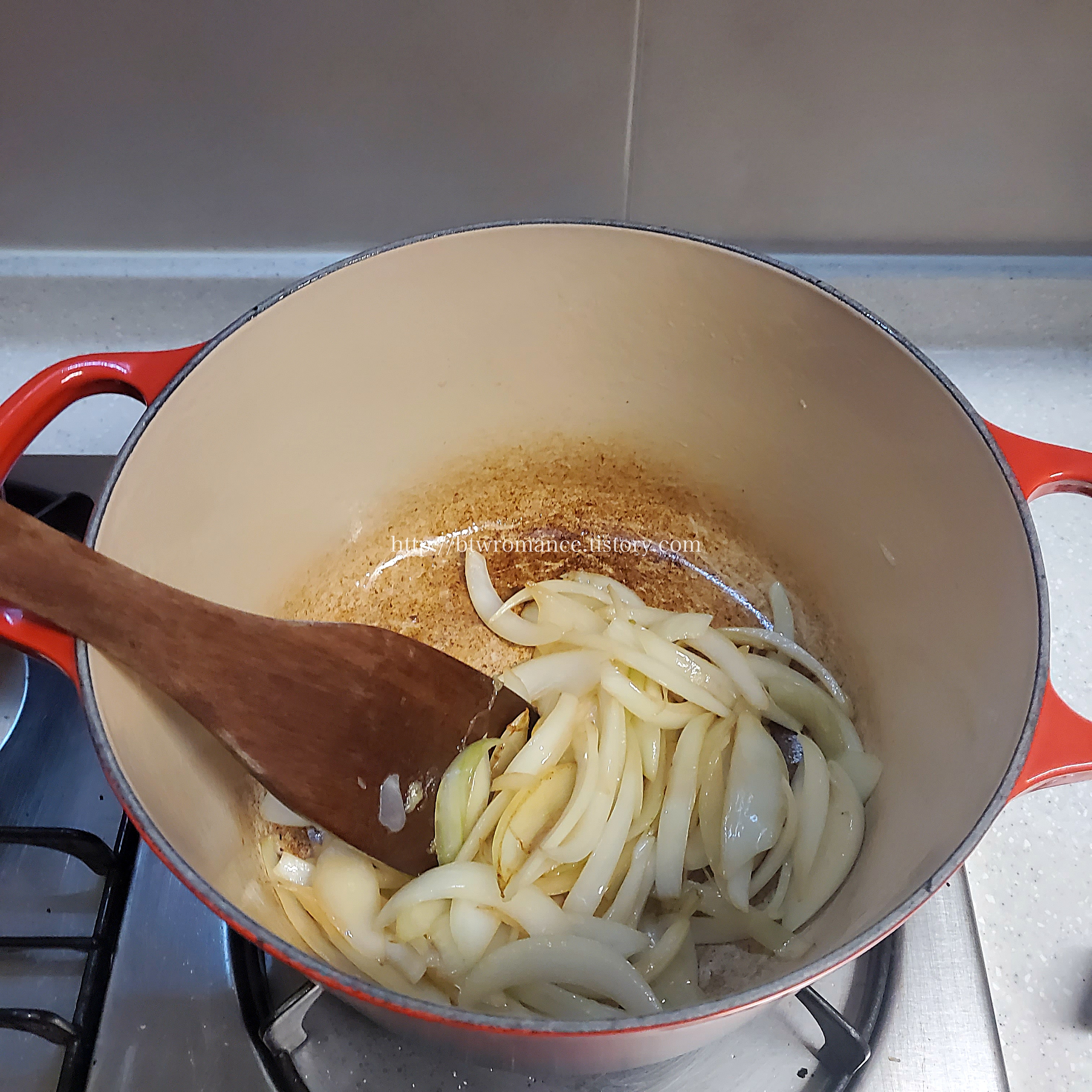 2. 양파를 갈색이 될 때까지 볶아준다.
