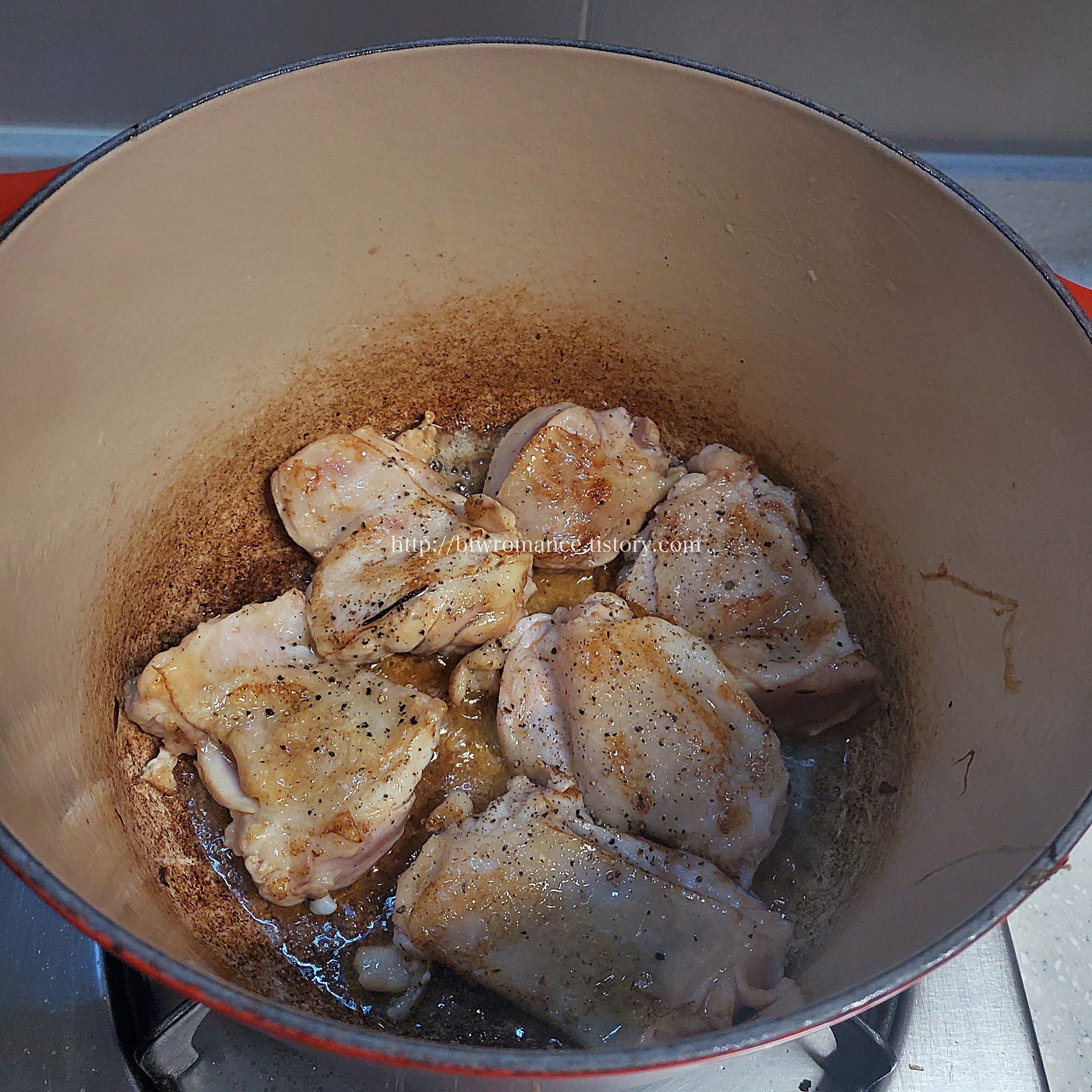 3. 닭다리살 정육을 기름부분을 바닥으로해서 구워준다.
