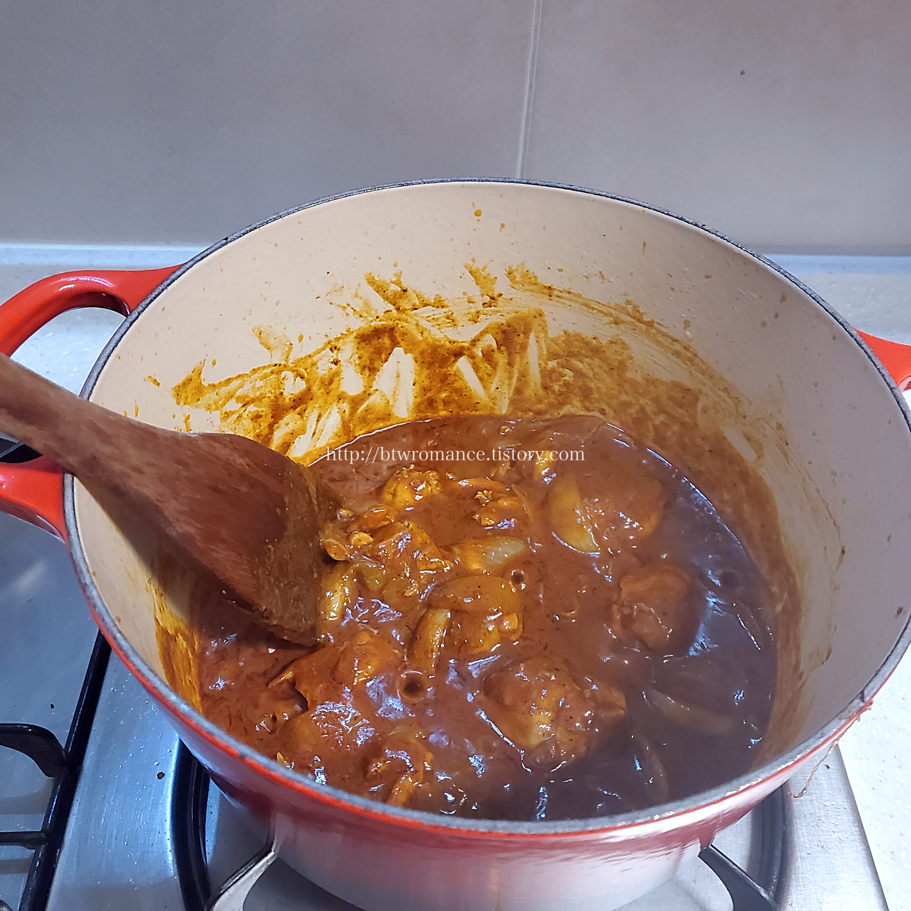 양파가 볶아져서 갈색이 되는 현상을 카라멜라이징 이라고하는데, 카라멜 라이징을 제대로 해 줄수록 이런 카레에서 깊은 맛이 나게된다.인내심을 가지고 볶아보자. 참고로 내 주물냄비는 양파가 갈색이 되기 전부터 바닥이 갈색으로 눌러 붙었지만 멈추지 않고 볶았다.