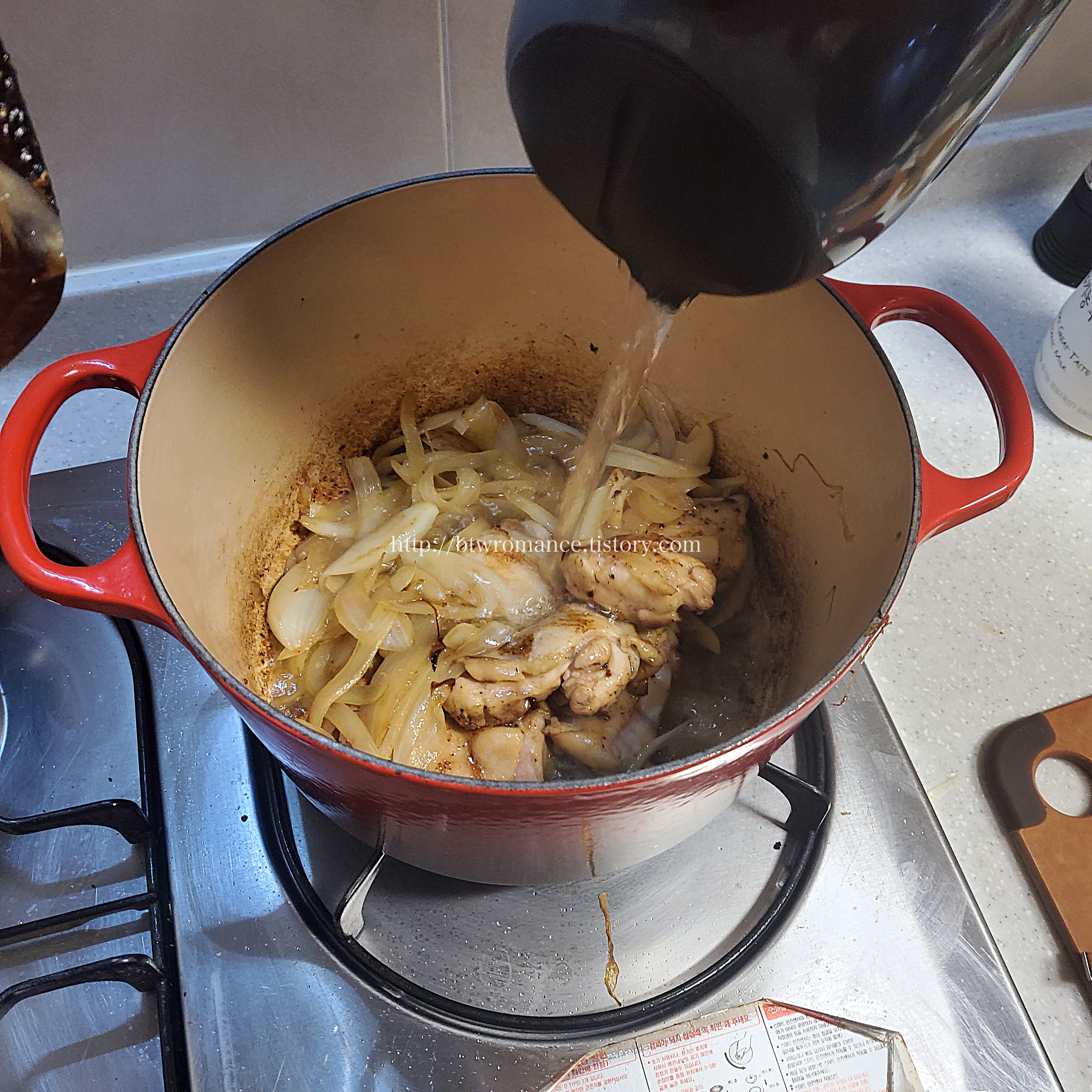 4. 닭고기가 맛있게 구워졌을때, 볶아뒀던 양파를 넣고 따뜻한 물 한컵 (200~300ml) 을 부어준다.
