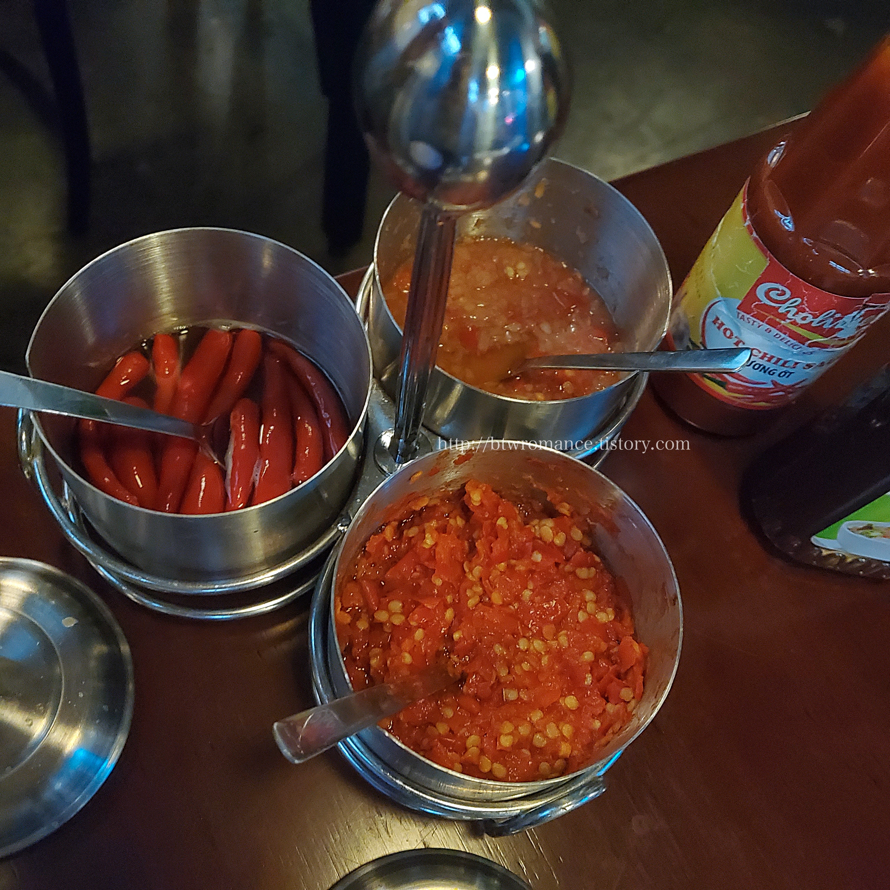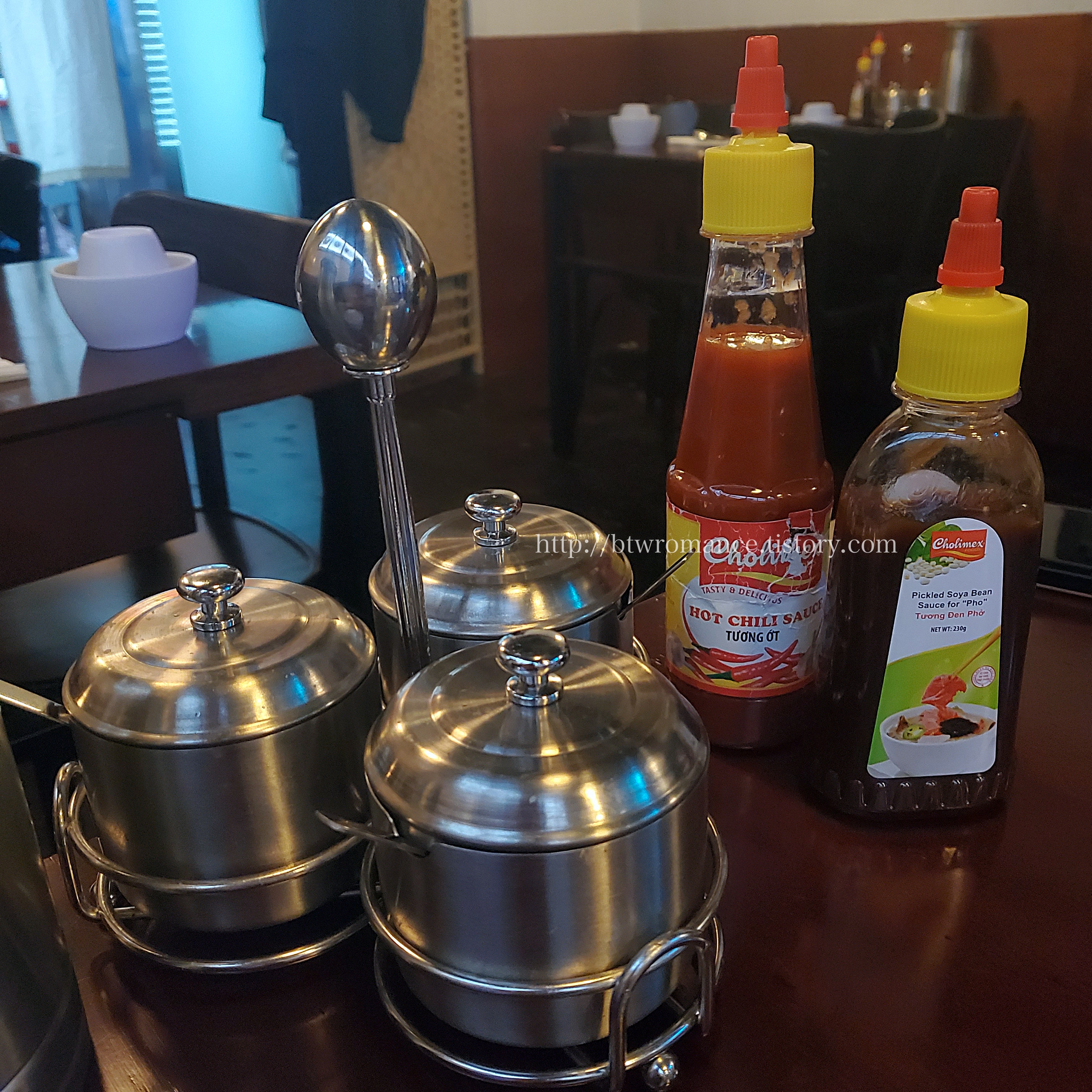 테이블마다 전통소스인듯한 고추소스3종과 우리가 흔히 어느 베트남 쌀국수 집에서든 만나는 사제 소스 2종이 올려져 있었다.고추소스는 나중에 매우 유용하게 쓰였다. 왜냐하면 이곳 쌀국수 국물이 유난히 달달하고 개운한 느낌이 덜하다.나랑 친구는 고추소스를 엄청 많이 풀어서 그나마 맘에 드는 맛을 찾았다.