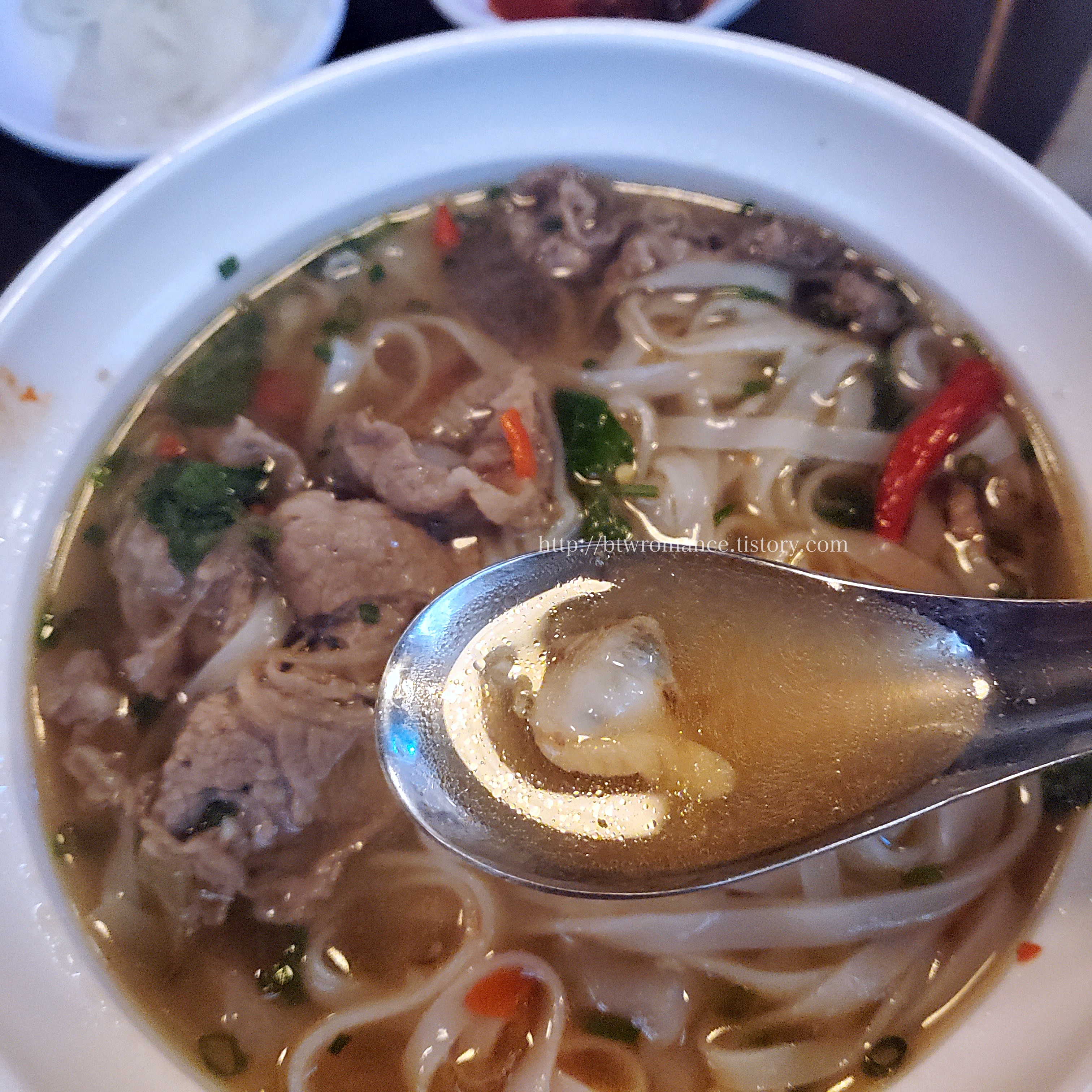 국물 안에 여러가지 재료가 들어있다. 평소 다른 쌀국수에서 보지 못한 조개살, 도가니 등등이 같이 들어있어서인지육수 맛이 색다르다.