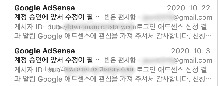 9월중순에 신청했을 때는, 블로그에 글이 10개도 안 되던 시절이었고, 결국 컨텐츠 부족으로 10월3일 거절을 당했다.