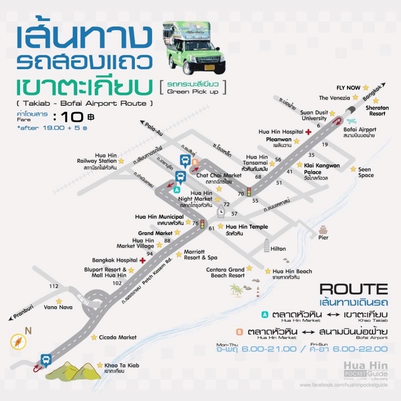 시카다 마켓에 가는 방법은 , 후아힌 야시장쪽에서부터 초록색 썽태우를 타야한다.후아힌 야시장쪽에 썽태우 정류장이 있지만, 그 외의 경우에는 그냥 길에서 썽태우를 보고 손을 들면 태워준다.탈땐 그냥 탄 다음에 목적지에 내린 다음 보조석에 가서 일인당 10바트(저녁7시 이후엔 15바트)를 내면 됨.