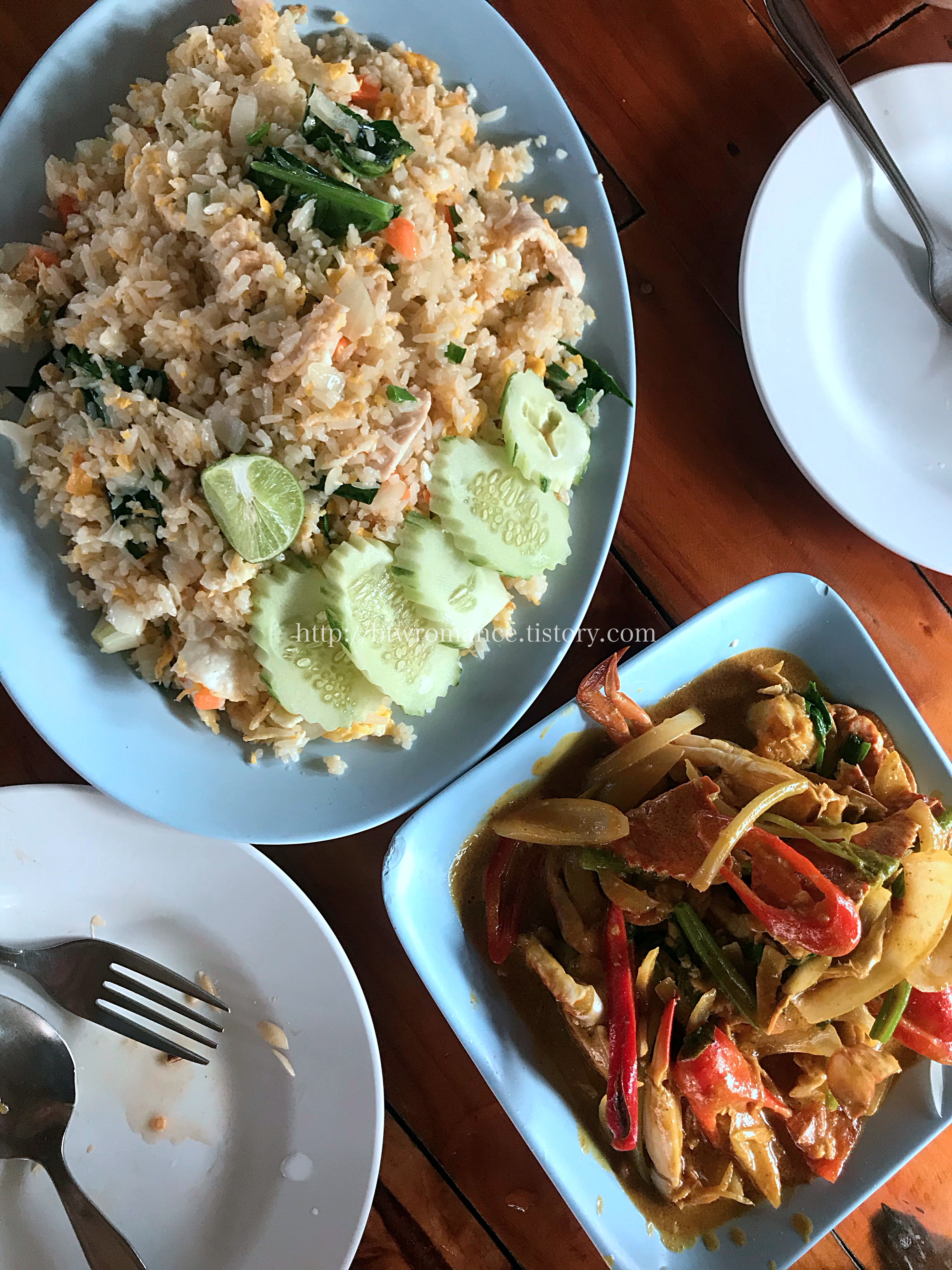 첫날 시킨 카오팟(볶음밥) 미디움 사이즈랑 뿌빳뽕커리(게 커리). 볶음밥의 양이 장난아니다. 미디움인데 족히 2인분은 넘어 보인다.