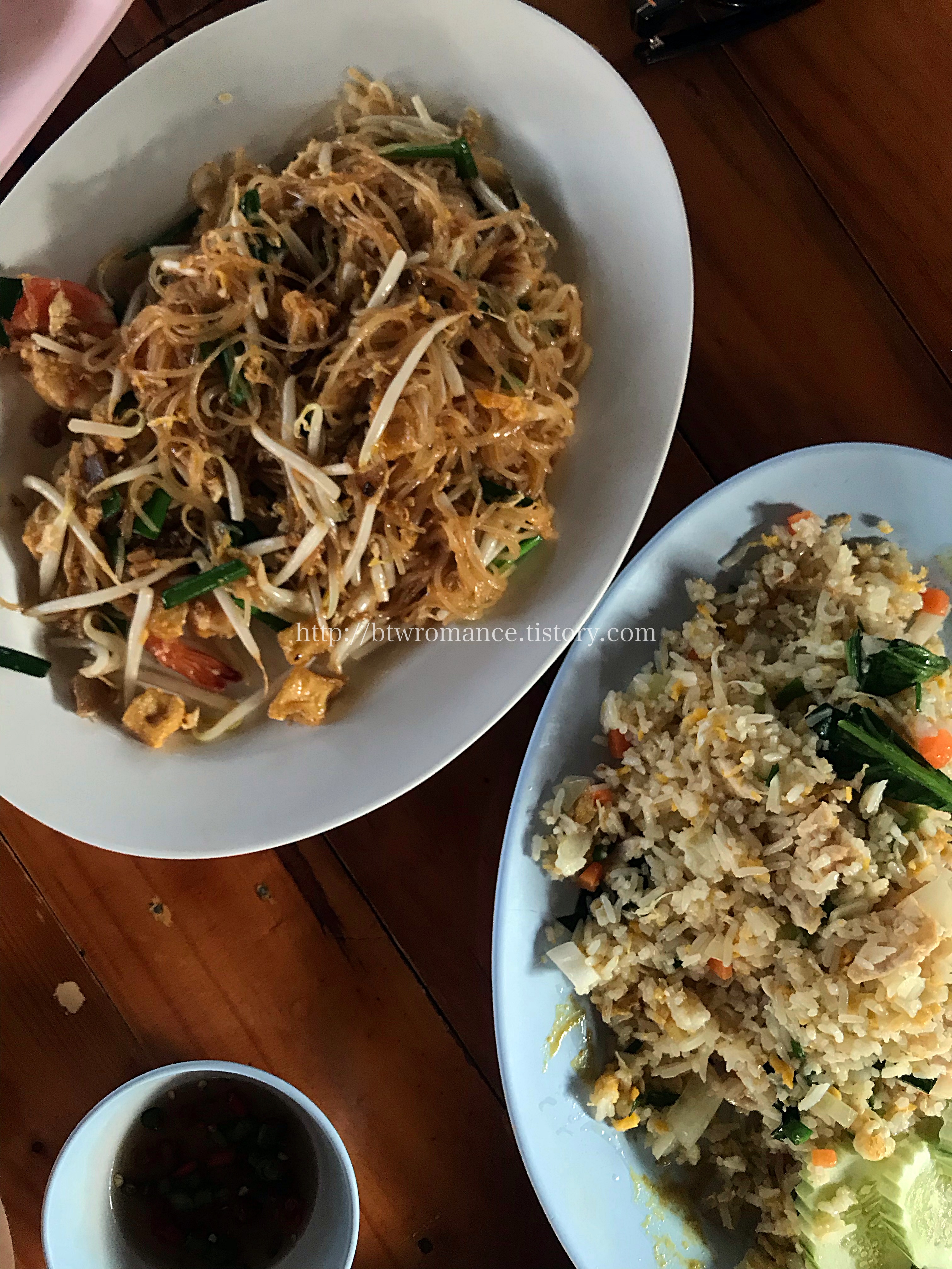 까이양과 함께 시킨 팟타이꿍(새우팟타이) 카오팟가이(닭볶음밥).
