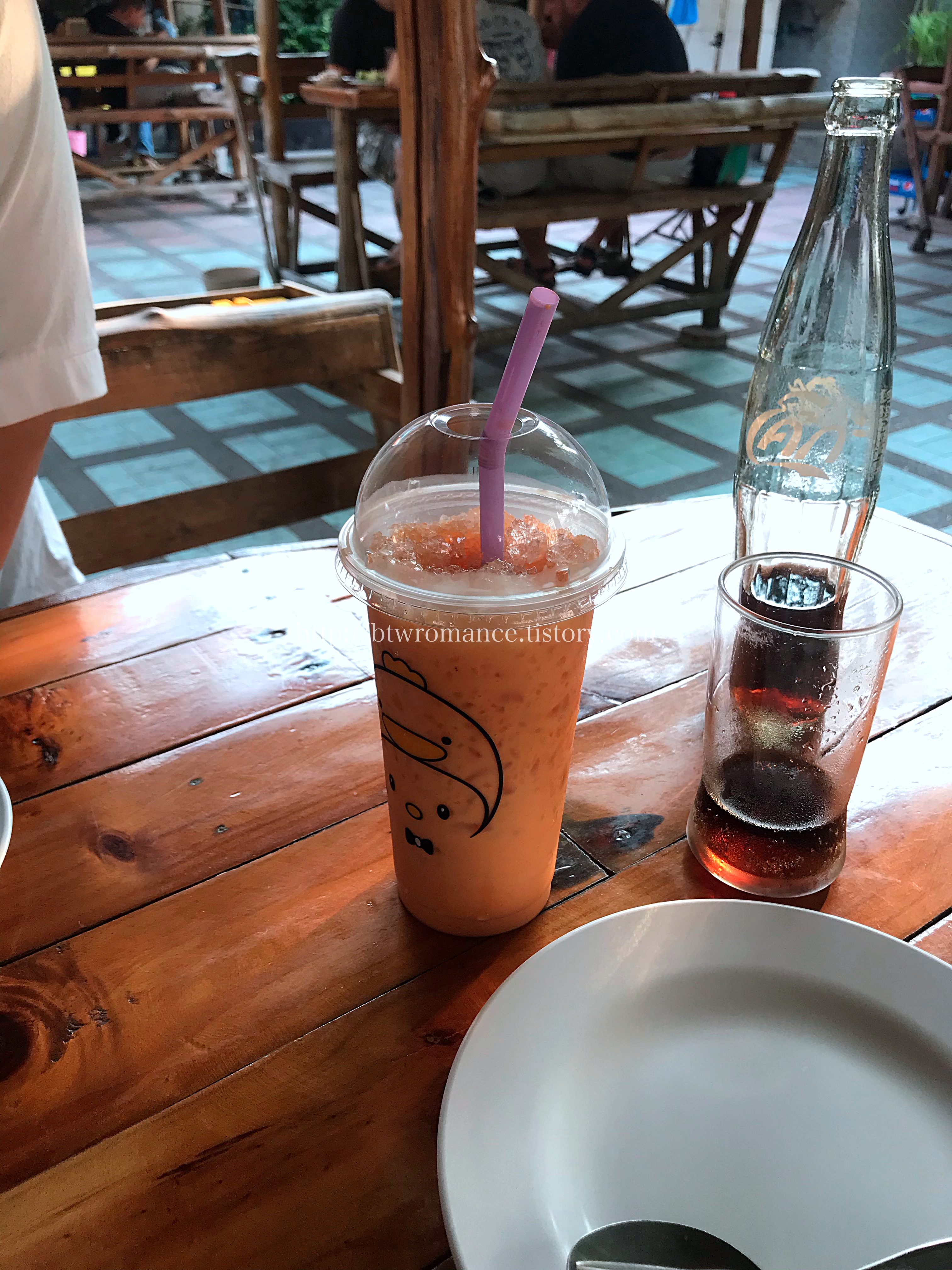 타이 아이스티를 주문했더니, 이곳 식당에서 팔지 않았던지, 바로 옆 가게에 가서 만들어다 주셨다 ㅎㅎㅎ아 그리고 모드 자리가 다 야외석이다 -!태국의 시골은 에어컨 있는 식당이 드물기 때문에 차라리 야외석인게 낫다.