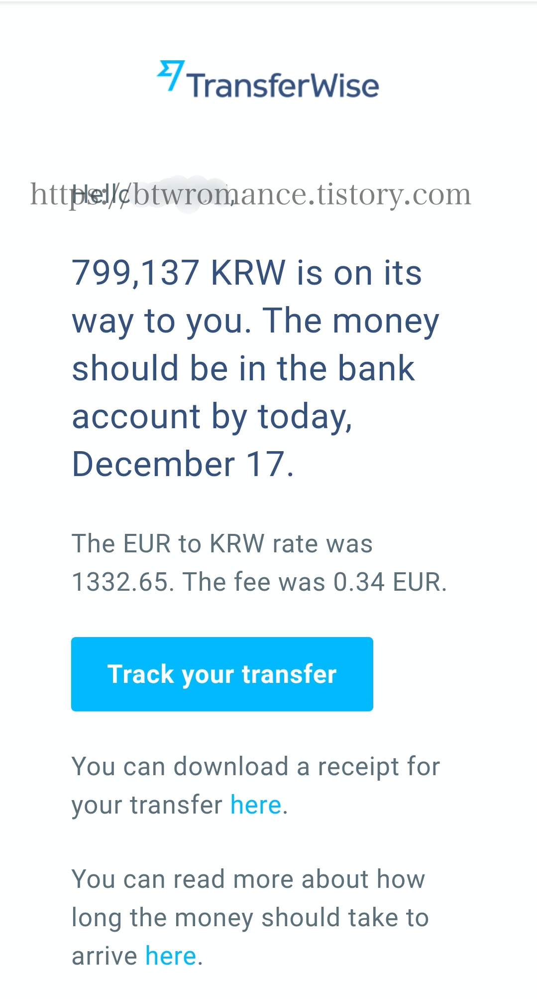 내가 송금한 날의 환율이 1유로= 1332.65원 이어서 600유로 = 799,590원 인데최종적으로 453원을 수수료로 떼이고 (약 0.34유로) 나머지 799,137원이 계좌에 도착했다.