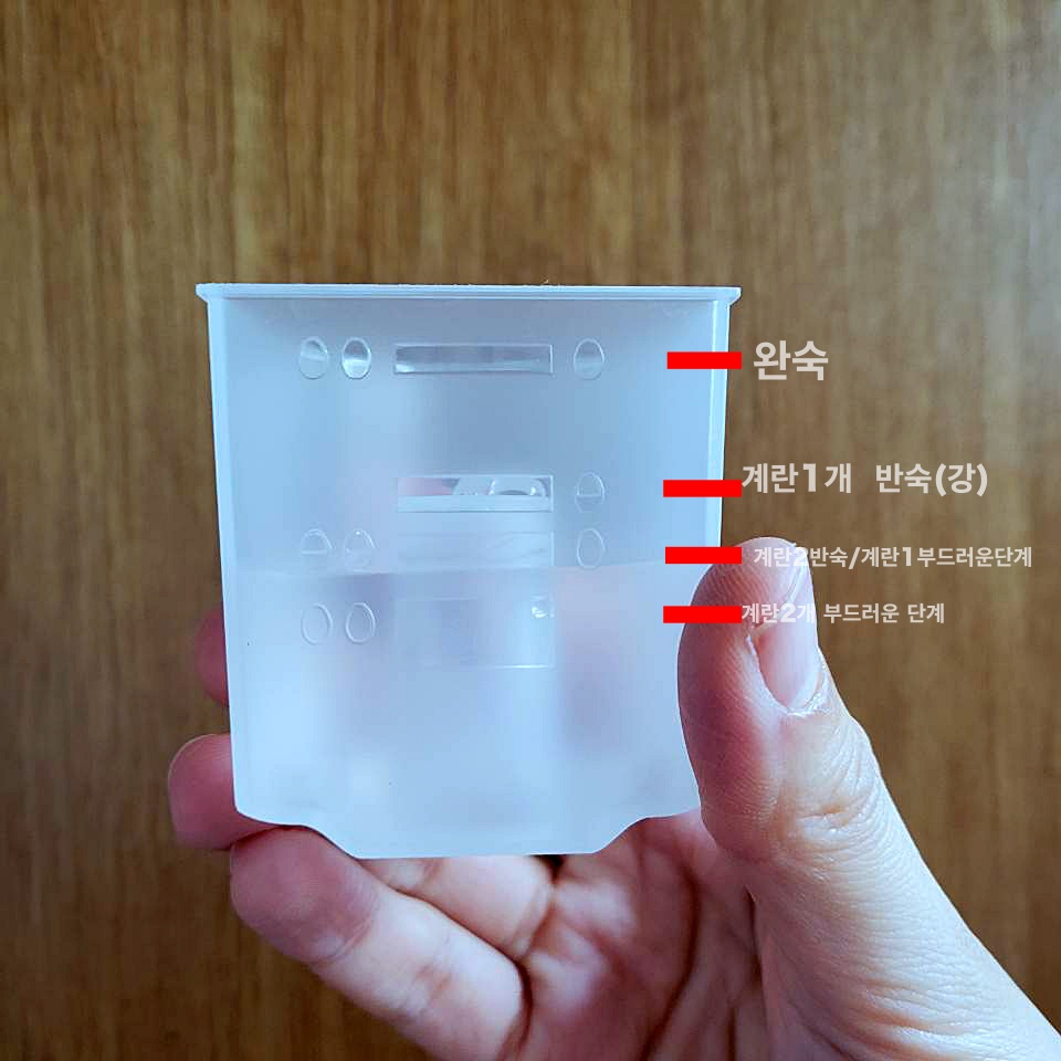제일 아래는 계란2개나 1개의 아주 부드러운 반숙상태에 필요한 물 양이다.