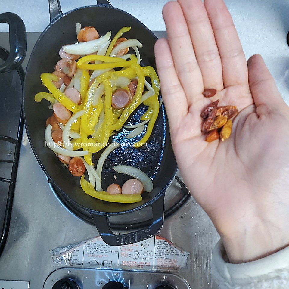 4. [이건 내 취향] 페페론치노를 한 줌 뿌셔 넣어준다.