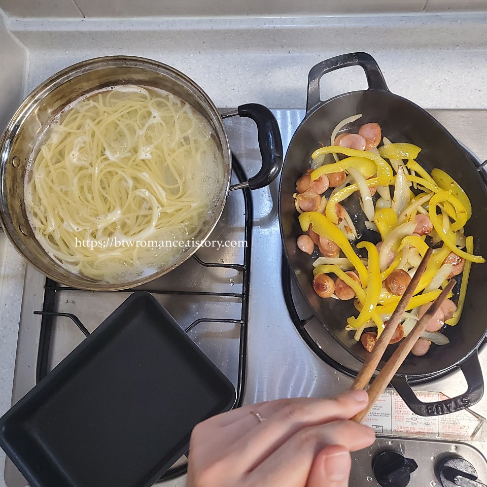 면을 익힌지 한 6~7분 이 지나면 슬슬 야채와 소시지를 볶기 시작한다.