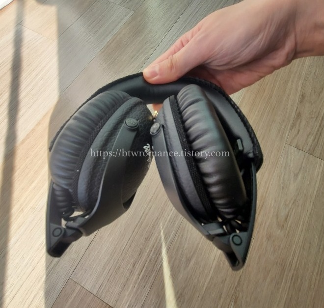 헤드폰이 부드럽게 잘 접히기 때문에 파우치에 무리없이 넣어 다닐 수 있다.