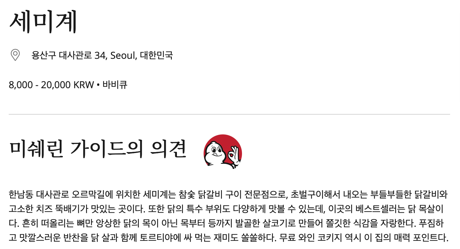 세미계 는 이영자가 '밥블레스유'에 나와 추천한 맛집이면서, 미슐랭(미쉐린)에서 추천하고있는 맛집이기도 하다.