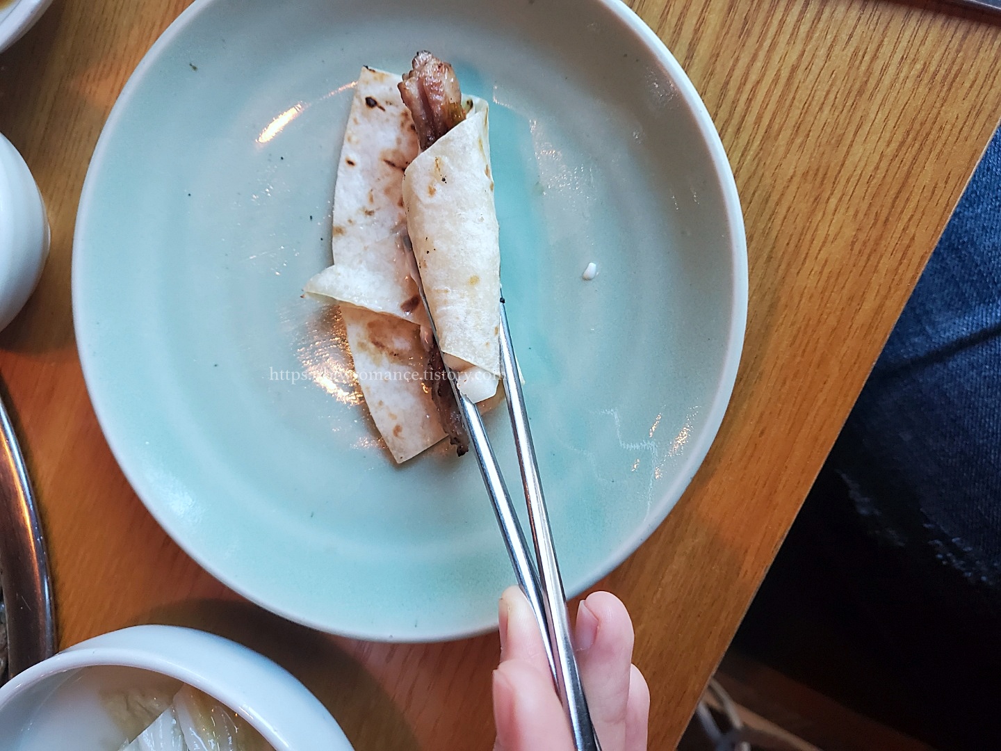 살짝 구운 토르티야 위에 닭목살 한점, 파김치한점, 갈릭마요네즈, 양파를 넣고 돌돌 말려먹으면
