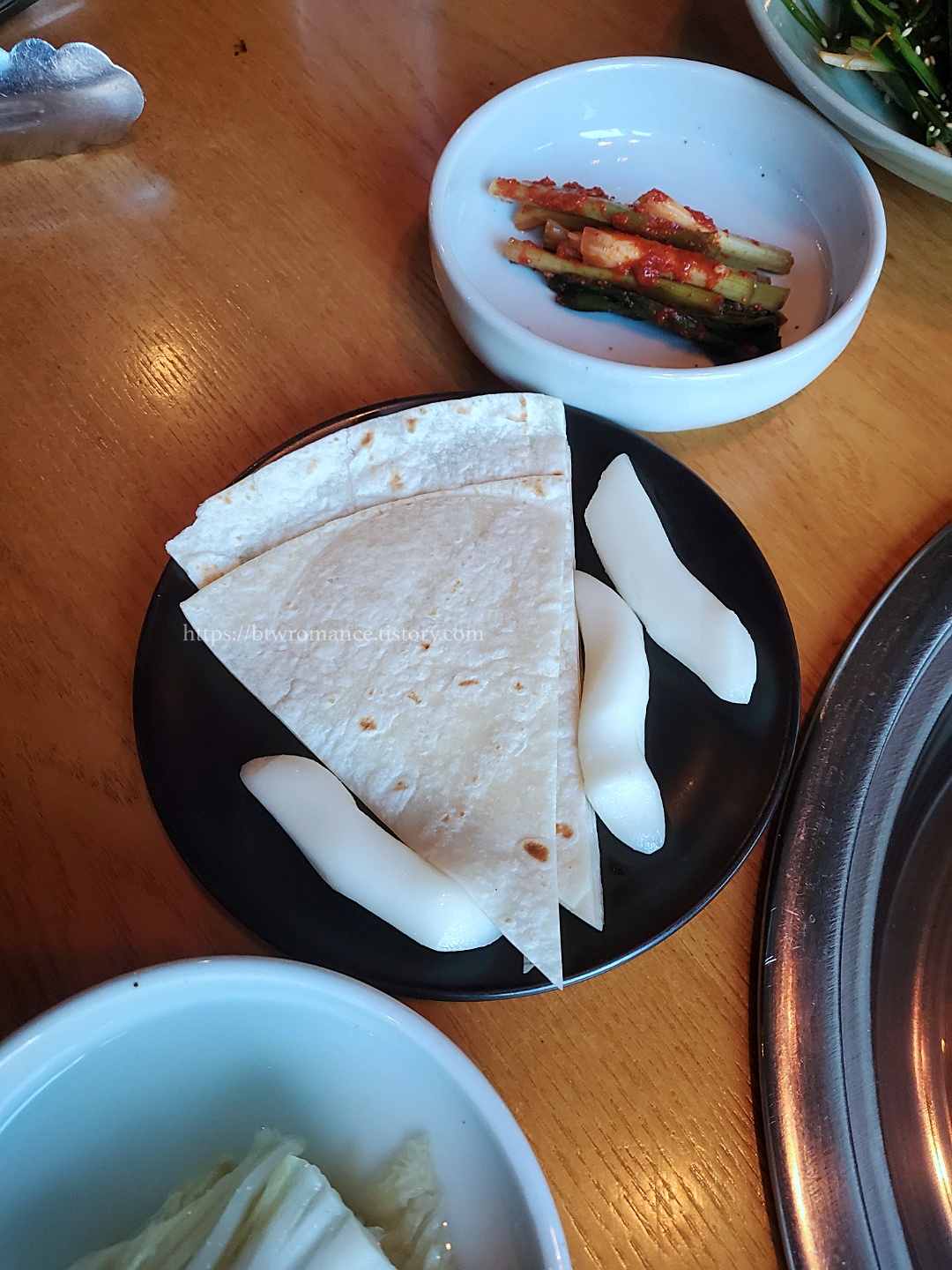 + 토르티야와 파김치 그리고 잘게 썬 양파, 간장계란소스, 갈릭마요네즈는
