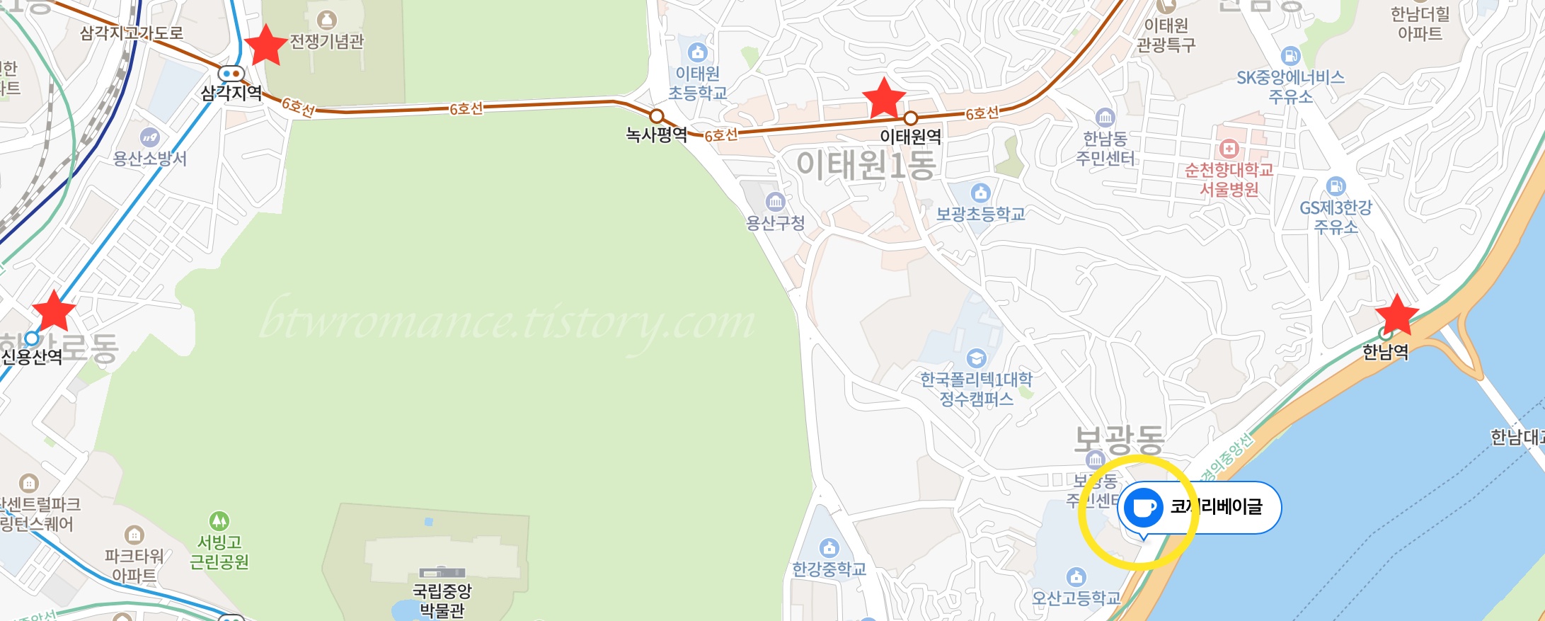 이태원 역에서 코끼리 베이글까지는 길 따라 천천히 산책으로 15분 ~20분 정도면 올 수 있고