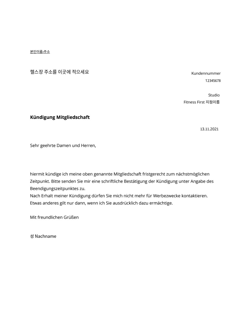 헬스장 계약 해지 편지 양식