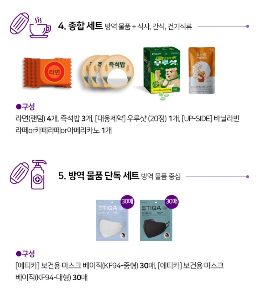 간식꾸러미와 함께 기본적으로 에티카 마스크 M사이즈 10매 ,L사이즈 10매, 세꼼마 손세정제, 손소독제, 파워살균소독티슈, 일반 물티슈가