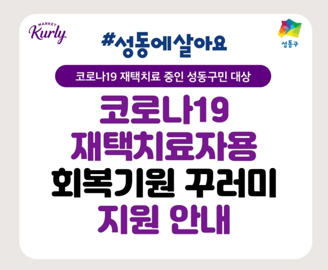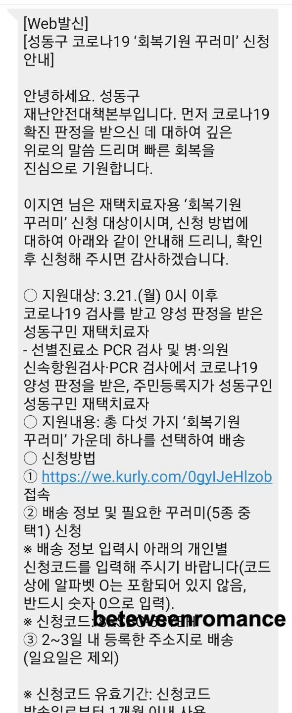 코로나 양성을 통보받고 , 성동구에서 격리통지서와 함께, '회복기원 꾸러미' 안내 문자를 보내주셨다.