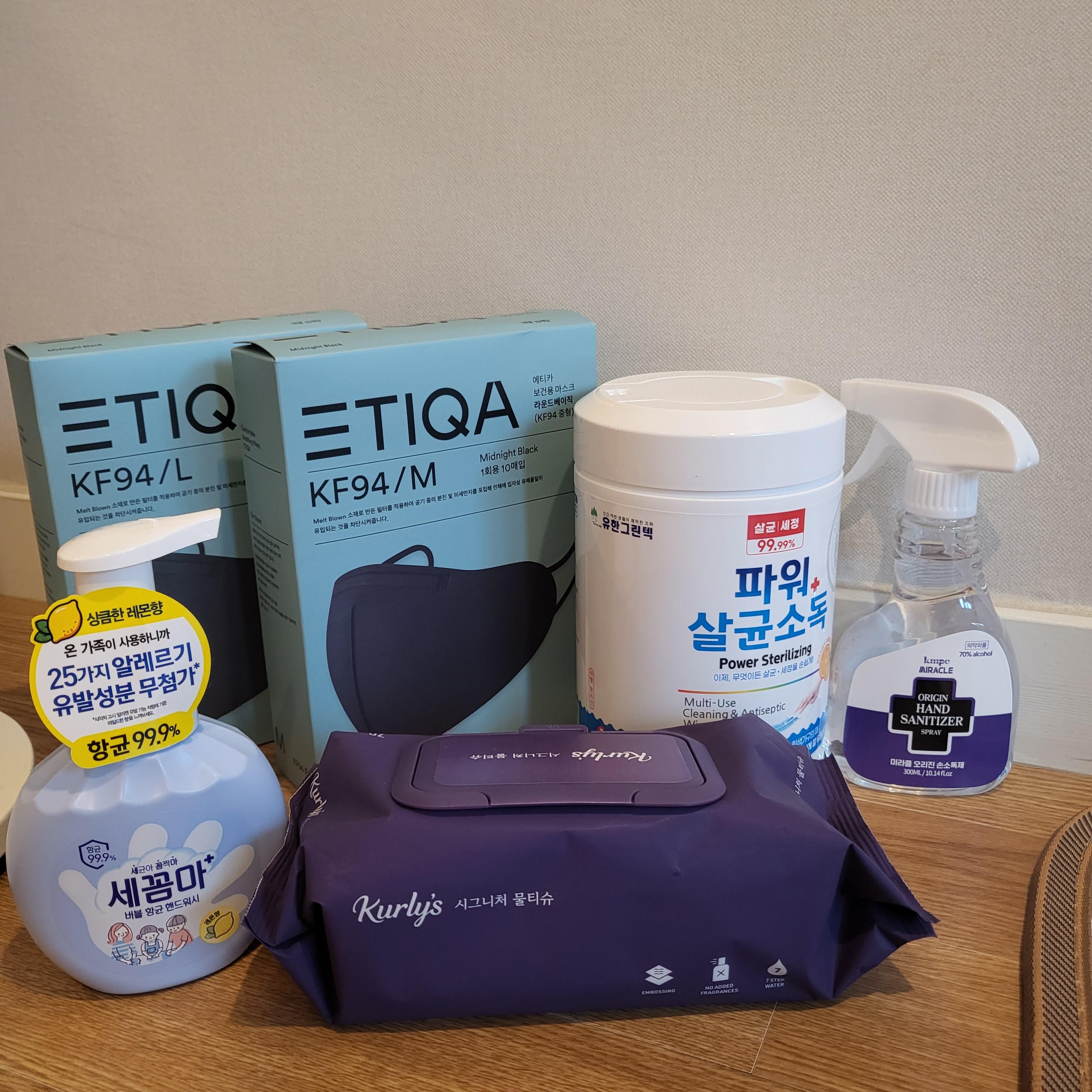 간식꾸러미와 함께 기본적으로 에티카 마스크 M사이즈 10매 ,L사이즈 10매, 세꼼마 손세정제, 손소독제, 파워살균소독티슈, 일반 물티슈가