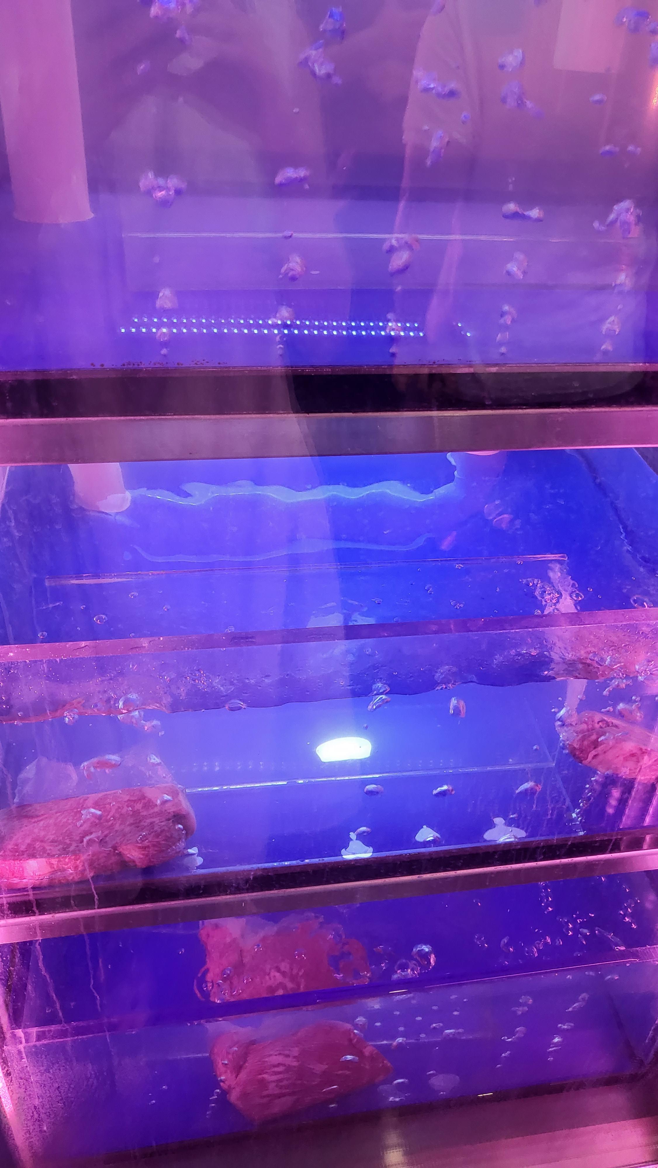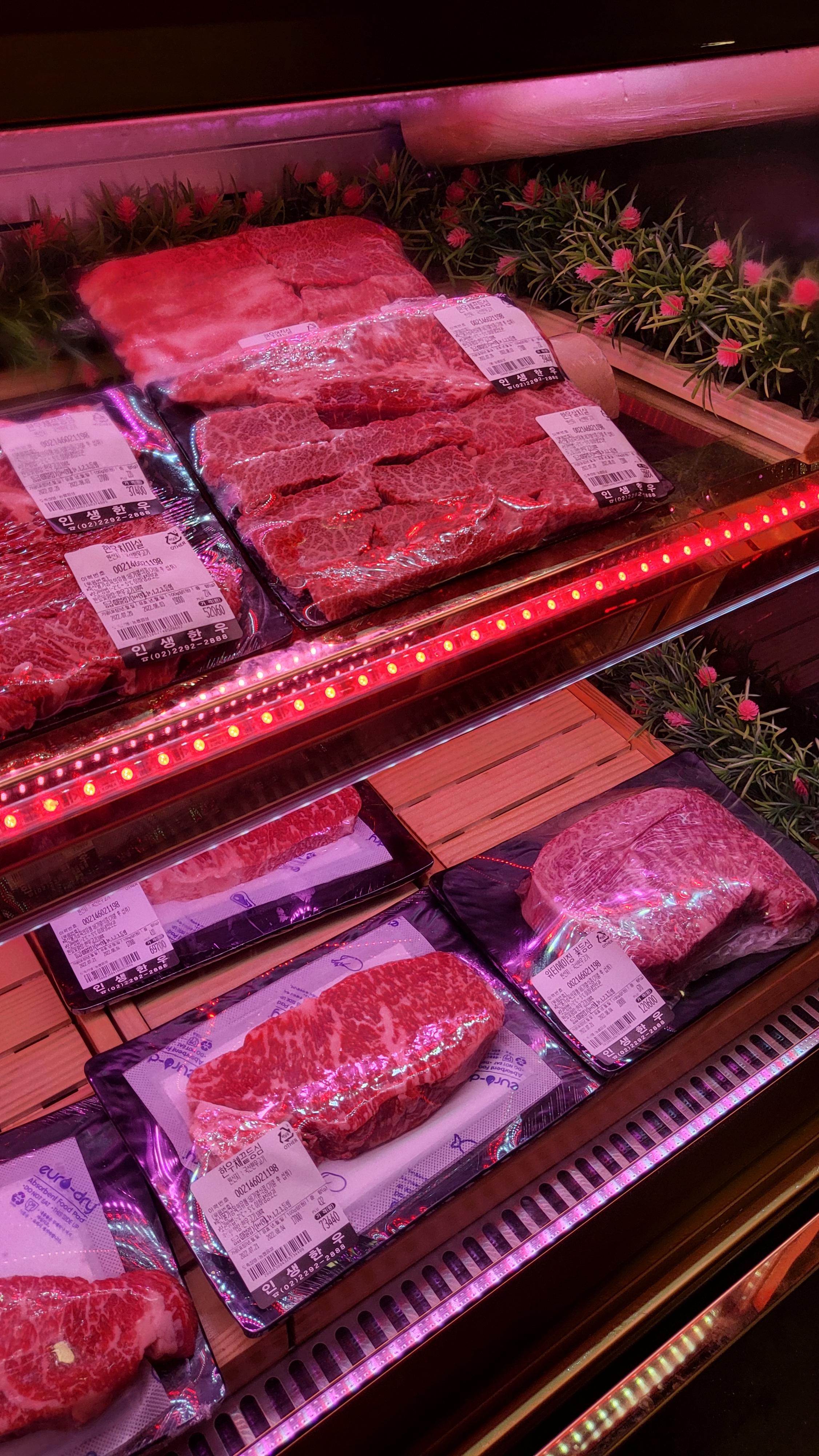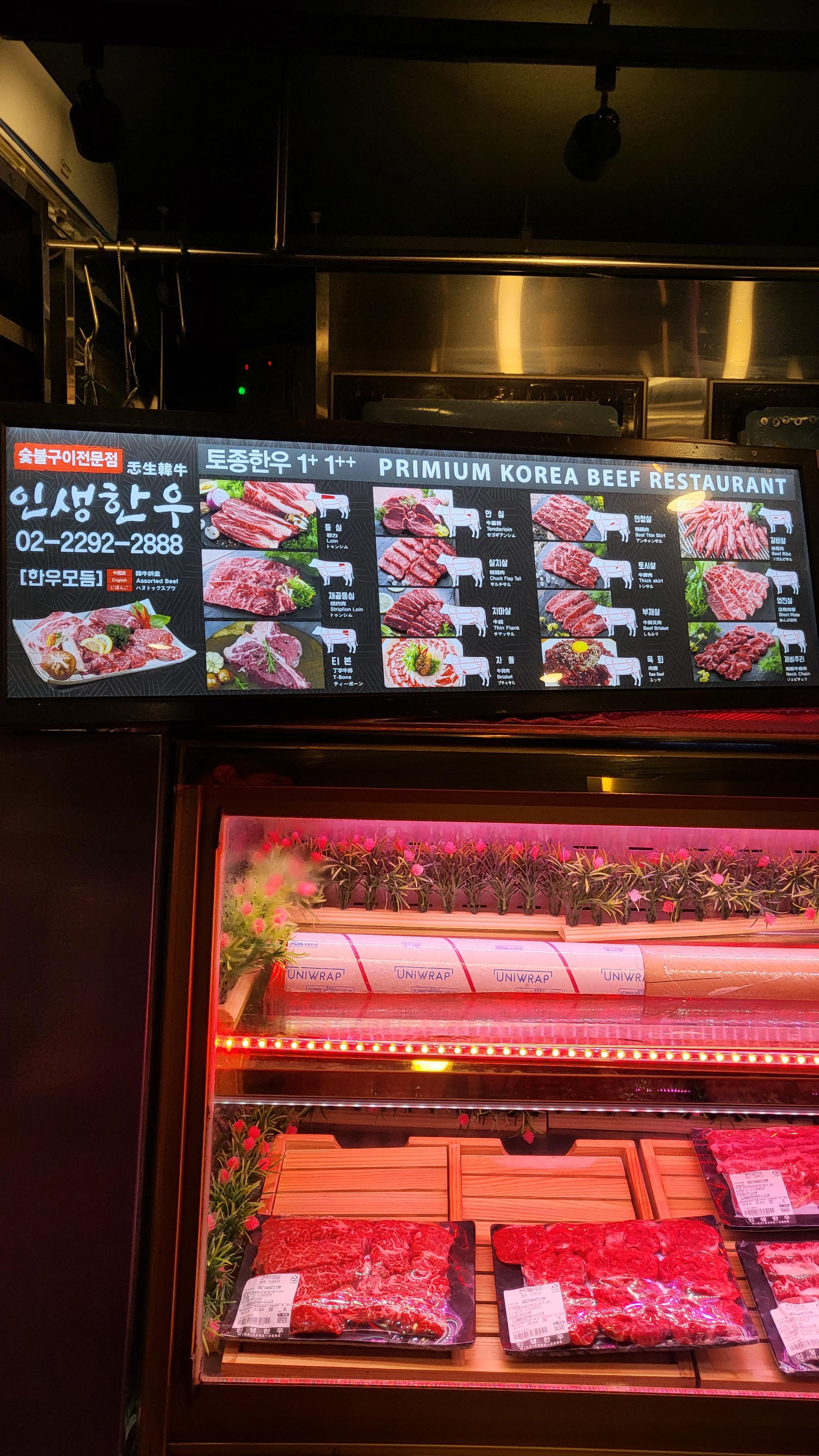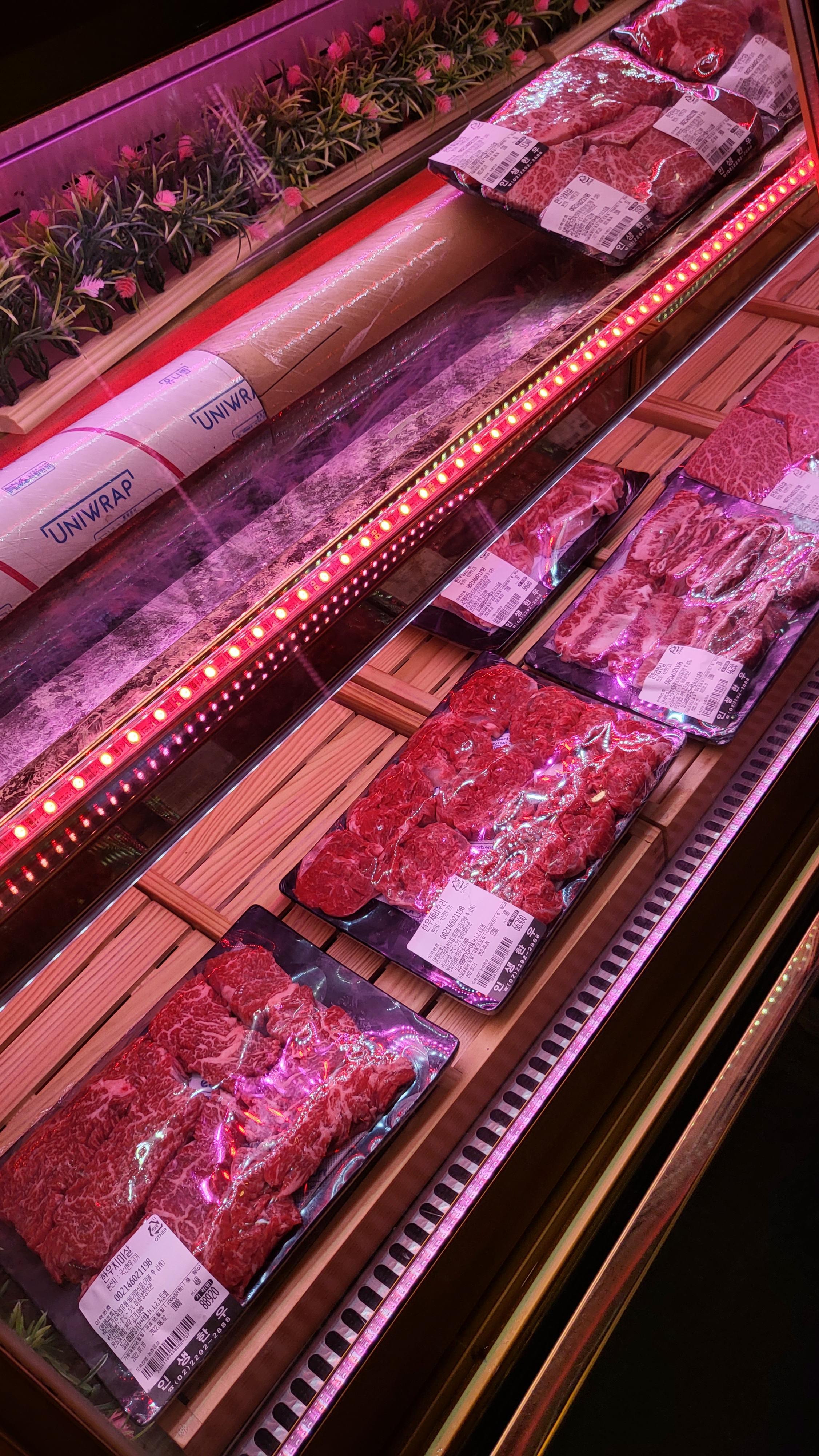 좌측엔 바로바로 썰어 나오는 한우부위별 고기들이 진열되어있다