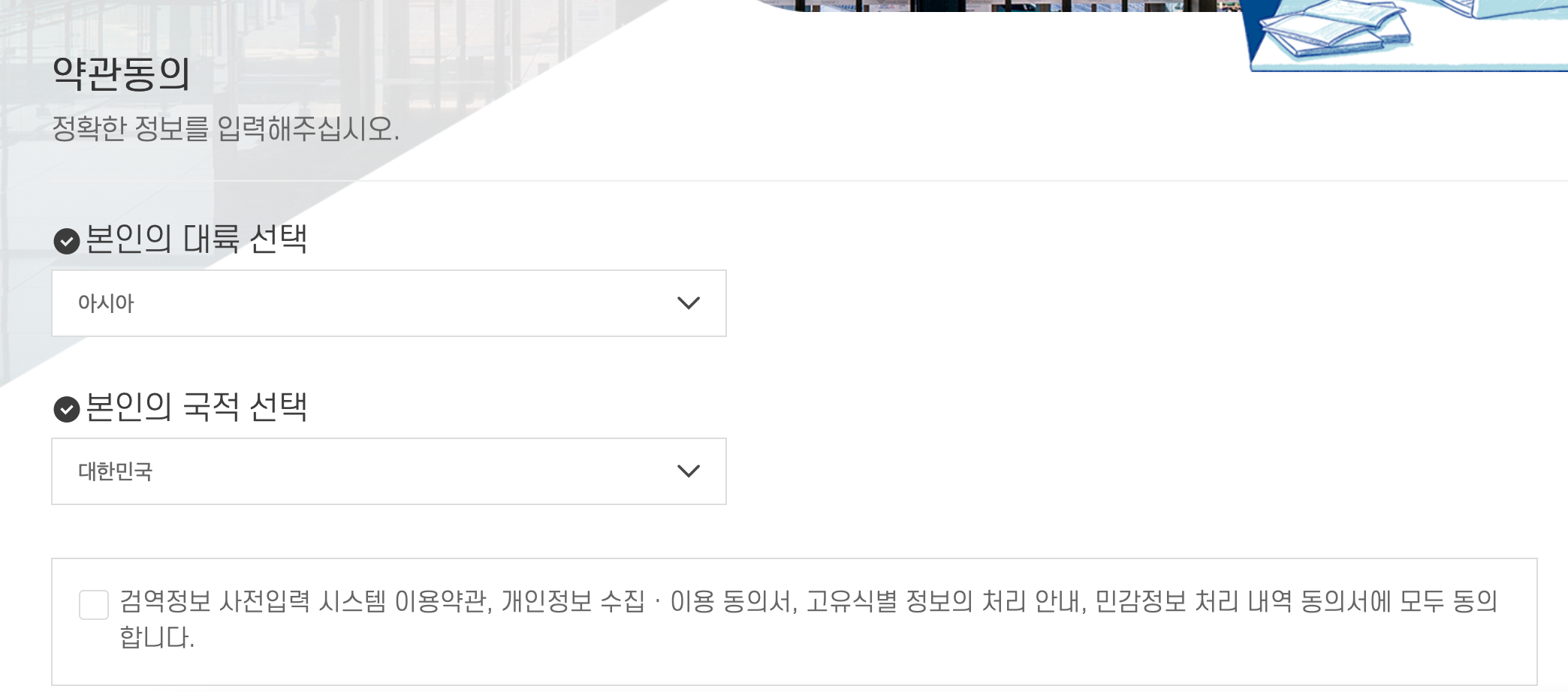 2. 본인의 대륙 '아시아' 본인의 국적 '대한민국'을 선택한 뒤 모든 약관에 동의를 체크한다.