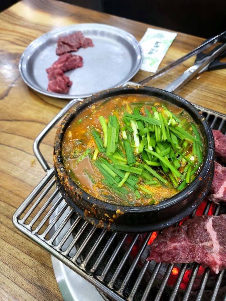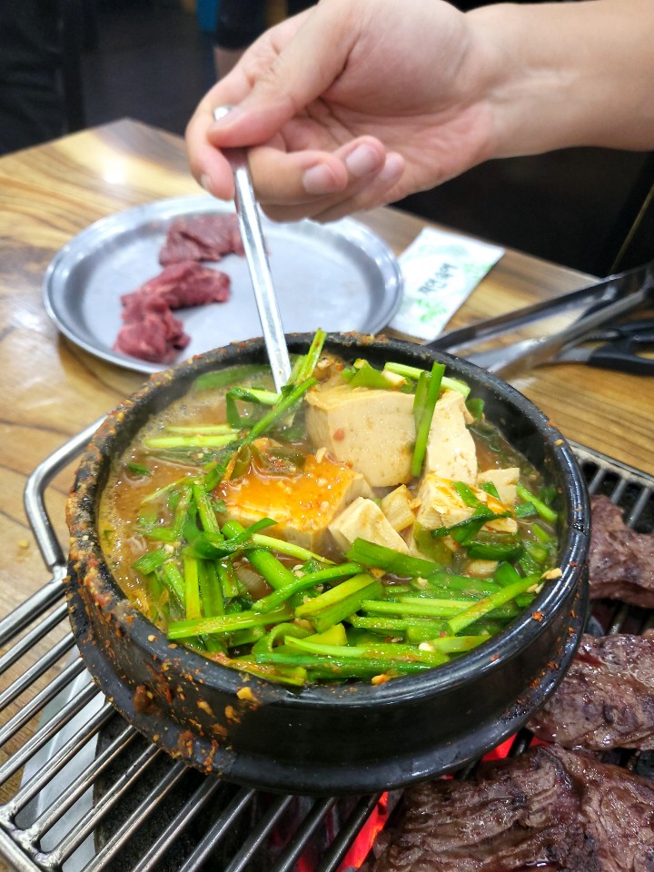 고기를 다 먹은경우엔, 고기 판을 없애고 숯불에 직화로 끓여주신다.